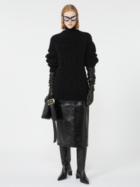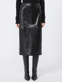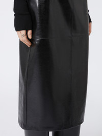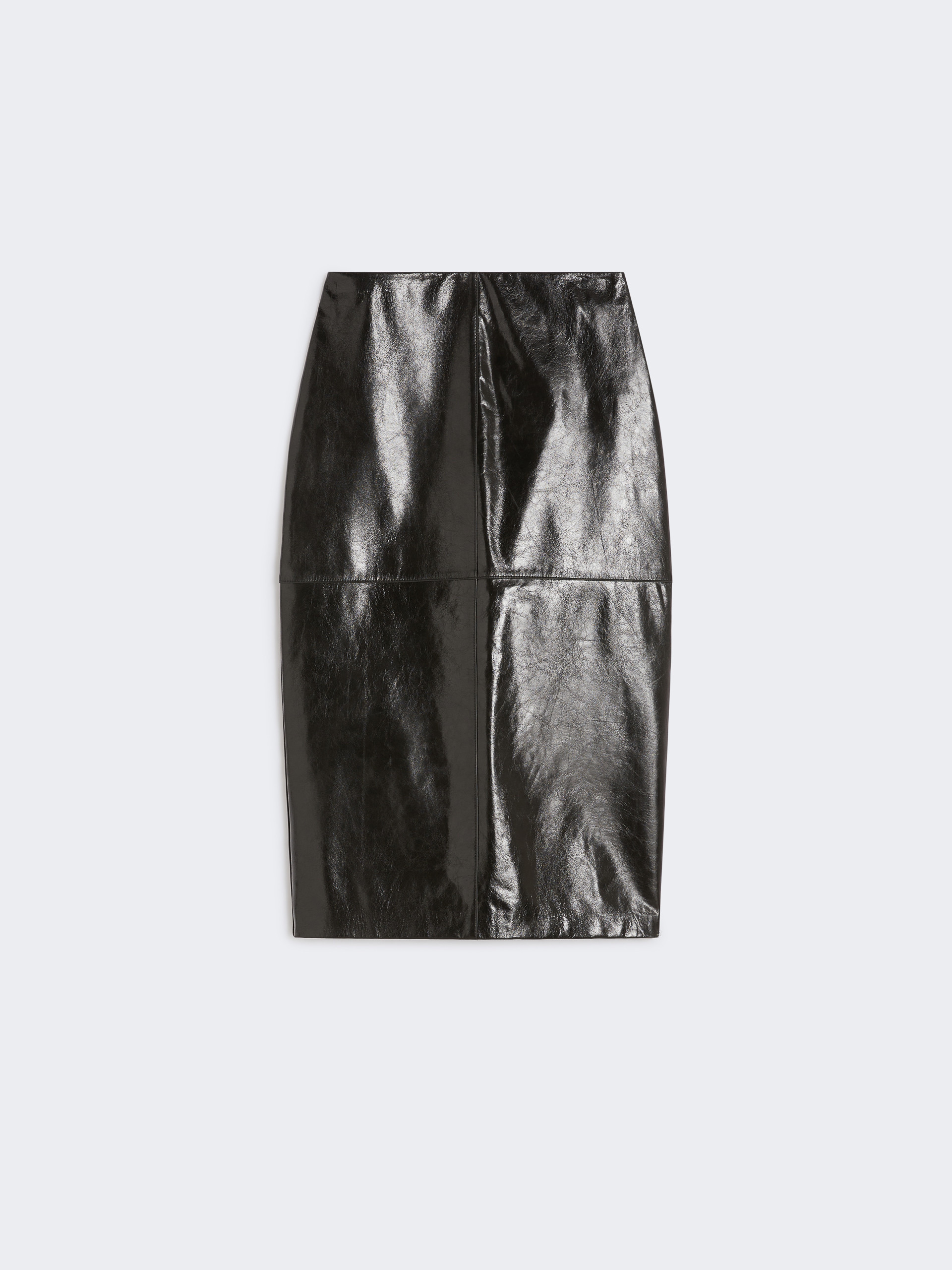 DETAILS Midi skirt in soft nappa leather, featuring clean lines and tonal stitching that highlights its structured cuts. Nappa leather skirt with a semi-glossy finish Straight fit Back zip fastening Geometric cut with on tone stitching Darts and covered back slit Regular fit COMPOSITION AND CARE Lamb leather. Do not wash; do not bleach; do not tumble dry; do not iron; do not dry clean; do not wet clean.; do not wash or dry clean by fabric methods. clean only by leather and fur specialists.; care should be taken with light-coloured garments and accessories because body heat could lead the leather to colour loss and staining. care should be taken when sitting on light-coloured surfaces, especially if damp. avoid lengthy exposure to direct light or heat sources. do not store garments in plastic bags for long periods. Distributed by Max Mara S.r.l., registered office in Reggio Emilia (Italy), Via Giulia Maramotti 4, 42124 (IT)