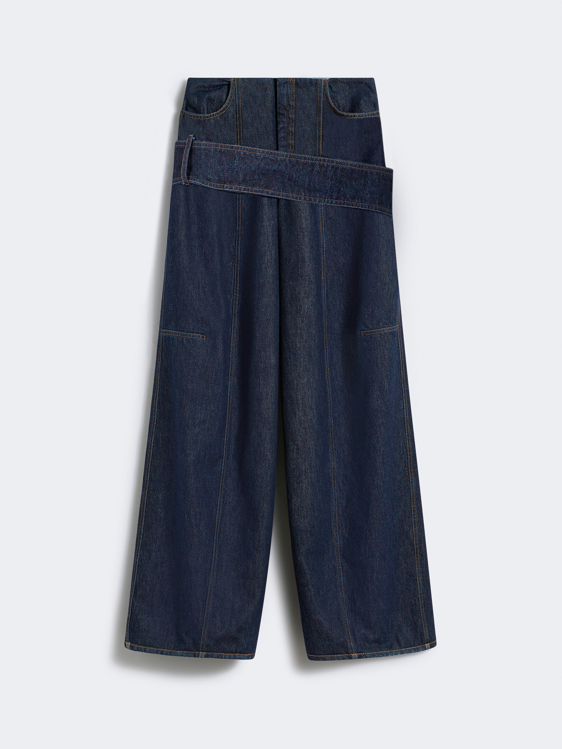 DETAILS Wide-fit trousers in soft denim fabric featuring a low-rise waist and dropped crotch, which are further emphasised by the belt wrapped around the hips. The knee tucks and vertical front darts complete the design. Trousers in authentic blue non-stretch denim with a raw dark-light wash Wide fit with a leg that tapers slightly at the hem Low-rise waist and dropped crotch Hip belt that creates yoke detail at the back Denim-style rounded pockets Loose fit COMPOSITION AND CARE 100% cotton. Machine wash cold delicate cycle; do not bleach; do not tumble dry; line drying in the shade; cool iron; professionally dry clean perchloroethylene - mild process.; wash the garment while it is fastened.; take care when wearing light-coloured clothes or accessories because, with the heat of the body, the indigo fabric , may fade and stain. be careful while sitting on light coloured surfaces, especially if wet. wash garments separately and always turned inside out. hang the garment turned inside out by avoiding to expose it to direct sunlight. avoid removing isolated stains. Distributed by Max Mara S.r.l., registered office in Reggio Emilia (Italy), Via Giulia Maramotti 4, 42124 (IT)