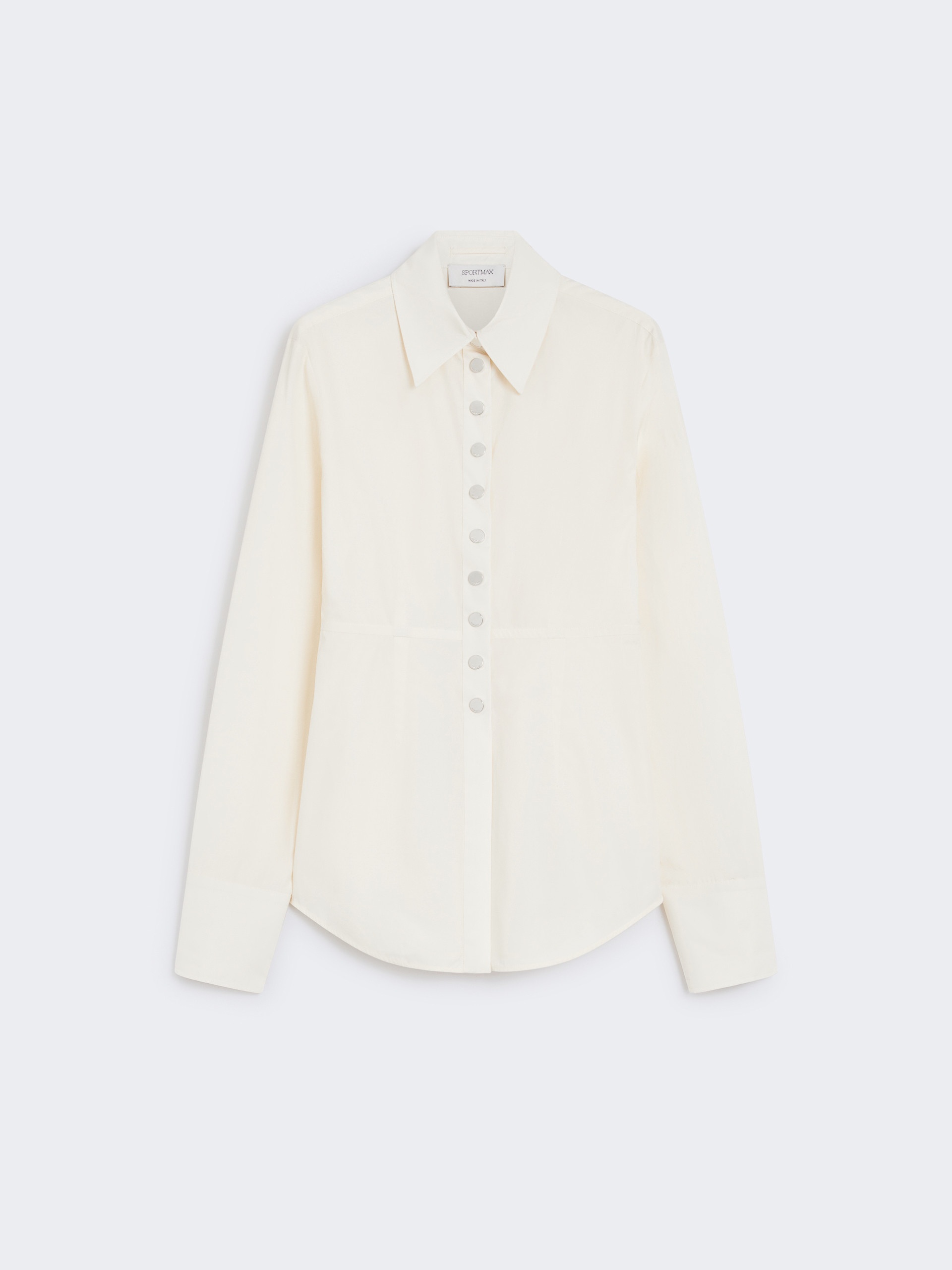 DETAILS Long shirt made of pure cotton poplin with a tight fit and a feminine line emphasized by the cut at the waist. Model with personalized metal snap buttons and high cuff with masculine-inspired button placket. Pure cotton poplin long shirt. Fitted Shirt collar and cuffs with man-made studs Visible closure with metal snap buttons and rounded hem Fitted waist and darts stitched on both the front and back Regular fit COMPOSITION AND CARE 100% cotton. Machine wash cold delicate cycle; do not bleach; do not tumble dry; line drying in the shade; cool iron; professionally dry clean perchloroethylene - mild process.; put this item into a string bag before washing it.; wash the garment while it is fastened.; turn the articles inside out before washing. Distributed by Max Mara S.r.l., registered office in Reggio Emilia (Italy), Via Giulia Maramotti 4, 42124 (IT)