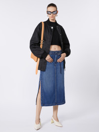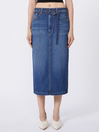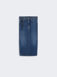 DETAILS Pencil skirt made of denim with a medium vintage treatment. The low waist is defined by the double-wrap belt, with a special S-buckle. Contrasting slits and stitching complete the design. Authentic non-stretch soft indigo denim skirt, with medium vintage treatment. Straight fit with low waist Five pocket construction Double-wrap low belt with custom S-buckle Tobacco thread stitching motif and side slits with snap buttons Regular fit COMPOSITION AND CARE 100% cotton. Machine wash cold delicate cycle; do not bleach; do not tumble dry; line drying in the shade; cool iron; professionally dry clean perchloroethylene - mild process.; wash the garment while it is fastened.; do not iron the buttons.; remove the buckle before washing.; take care when wearing light-coloured clothes or accessories because, with the heat of the body, the indigo fabric , may fade and stain. be careful while sitting on light coloured surfaces, especially if wet. wash garments separately and always turned inside out. hang the garment turned inside out by avoiding to expose it to direct sunlight. avoid removing isolated stains.; contains non-textile parts of animal origin. Distributed by Max Mara S.r.l., registered office in Reggio Emilia (Italy), Via Giulia Maramotti 4, 42124 (IT)