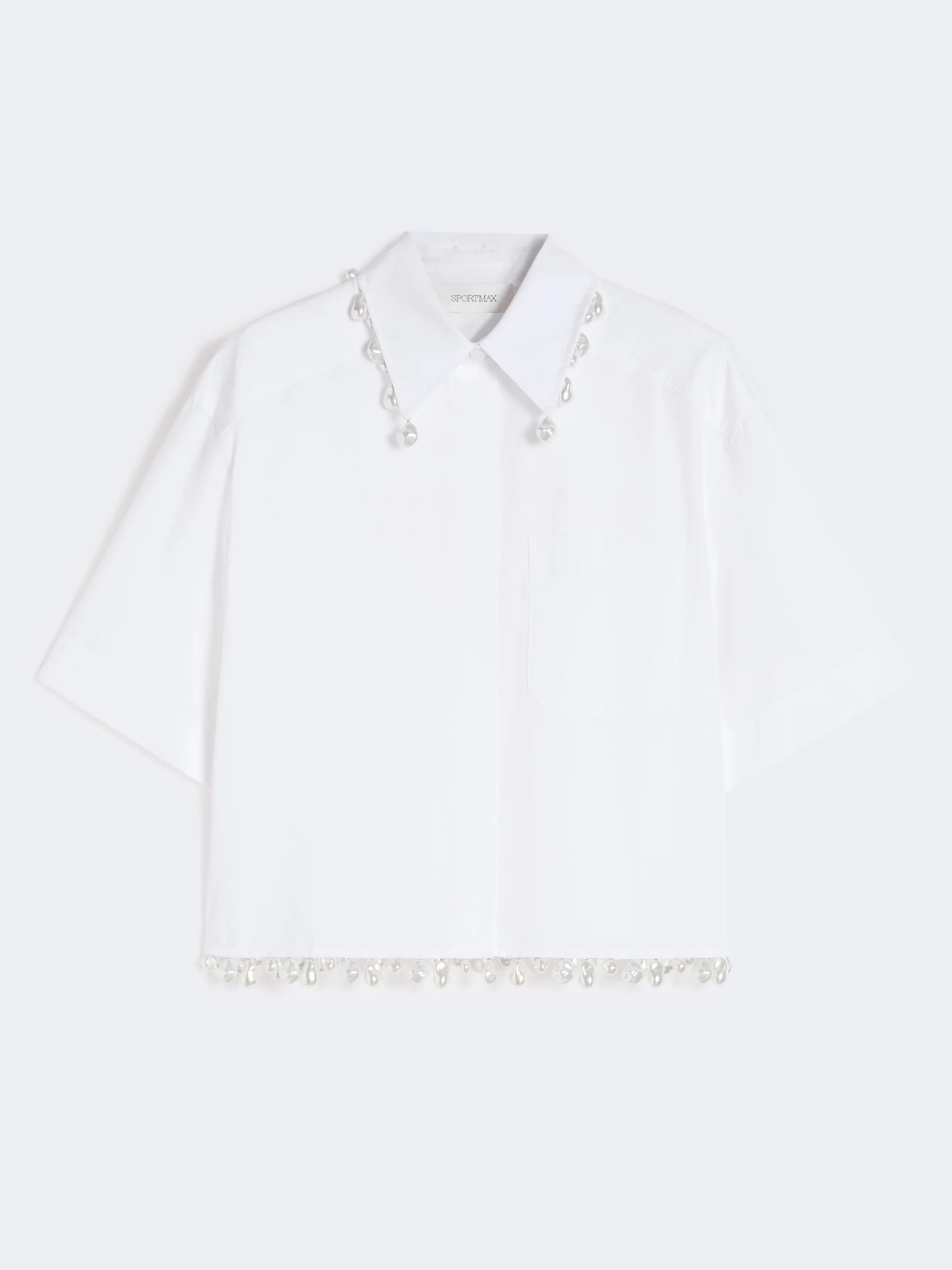 DETAILS Boxy-cut pure cotton poplin shirt with a straight-cut bodice. Three-dimensional baroque beads hand-embroidered on the neck and hem of the garment. - Cotton poplin shirt - Shirt collar with a placket-covered button fastening - Loose-fitting short sleeves - Pearl detail sewn onto the neck and hem - Regular fit COMPOSITION AND CARE Fabric 100% cotton; - exclusive of decoration. Hand wash cold (40°c max); do not bleach; do not tumble dry; line drying in the shade; cool iron; do not dry clean; do not wet clean.; put this item into a string bag before washing it. Distributed by Max Mara S.r.l., registered office in Reggio Emilia (Italy), Via Giulia Maramotti 4, 42124 (IT) Collection: Sportmax Product code: 2111076206001 - SPXCOGNAC