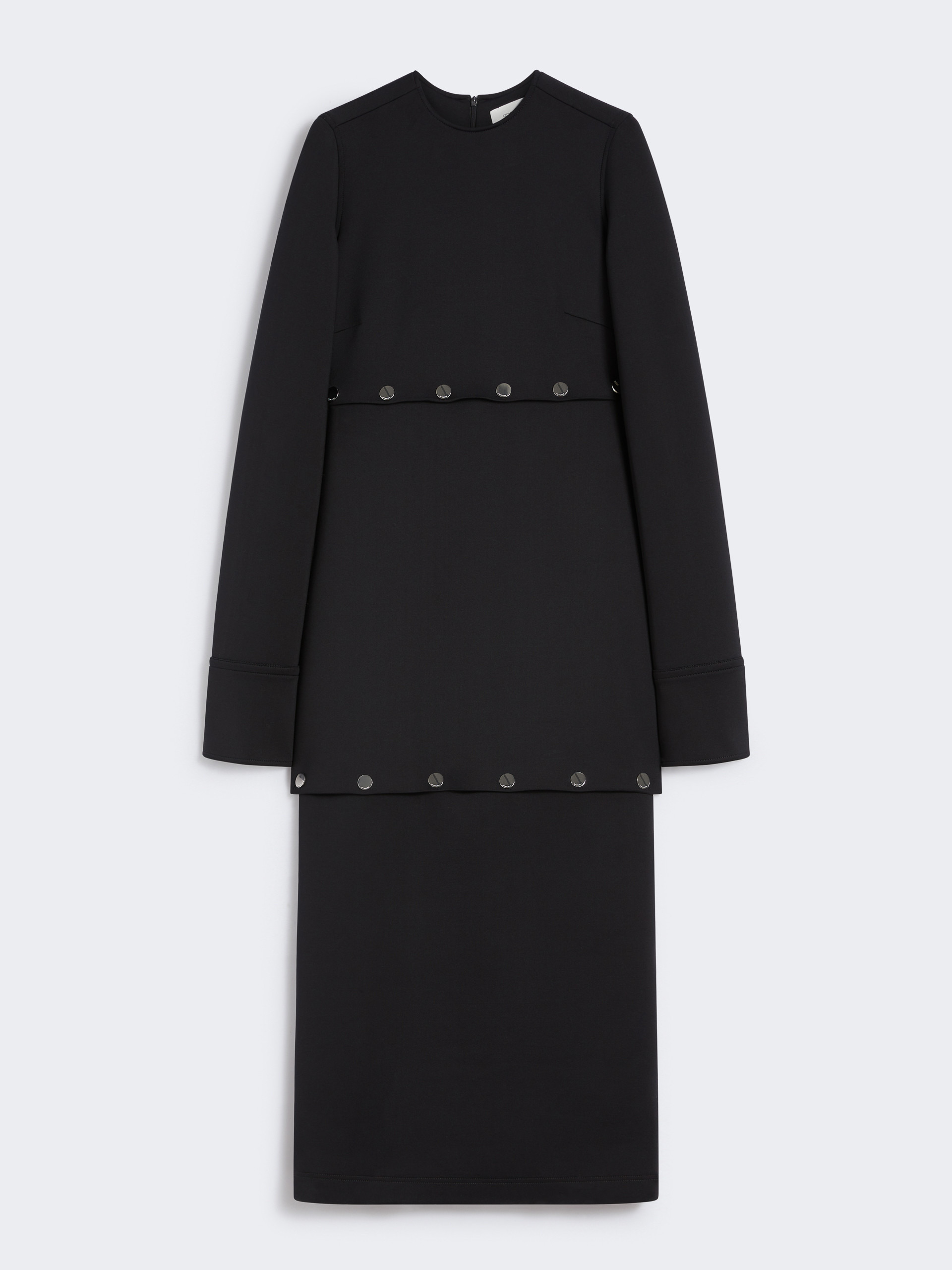 DETAILS Scuba jersey dress with modular design: snap buttons enable it to be shortened into a mini dress or top, or to open keyhole openings as desired. Scuba jersey dress Unstructured fit Back zip fastening Custom metal button motif, perfect for wearing cropped, as a mini dress, or with openings Shirt sleeve with cuff and double button closure Regular fit COMPOSITION AND CARE 50% modal, 44% polyester, 6% elastane. Hand wash cold (40°c max); do not bleach; do not tumble dry; drip line drying in the shade; cool iron; professionally dry clean perchloroethylene - mild process; do not wet clean.; iron with a cloth between.; using neutral detergent.; don’t rub.; turn the articles inside out before washing.; to be ironed on reverse. Distributed by Max Mara S.r.l., registered office in Reggio Emilia (Italy), Via Giulia Maramotti 4, 42124 (IT)