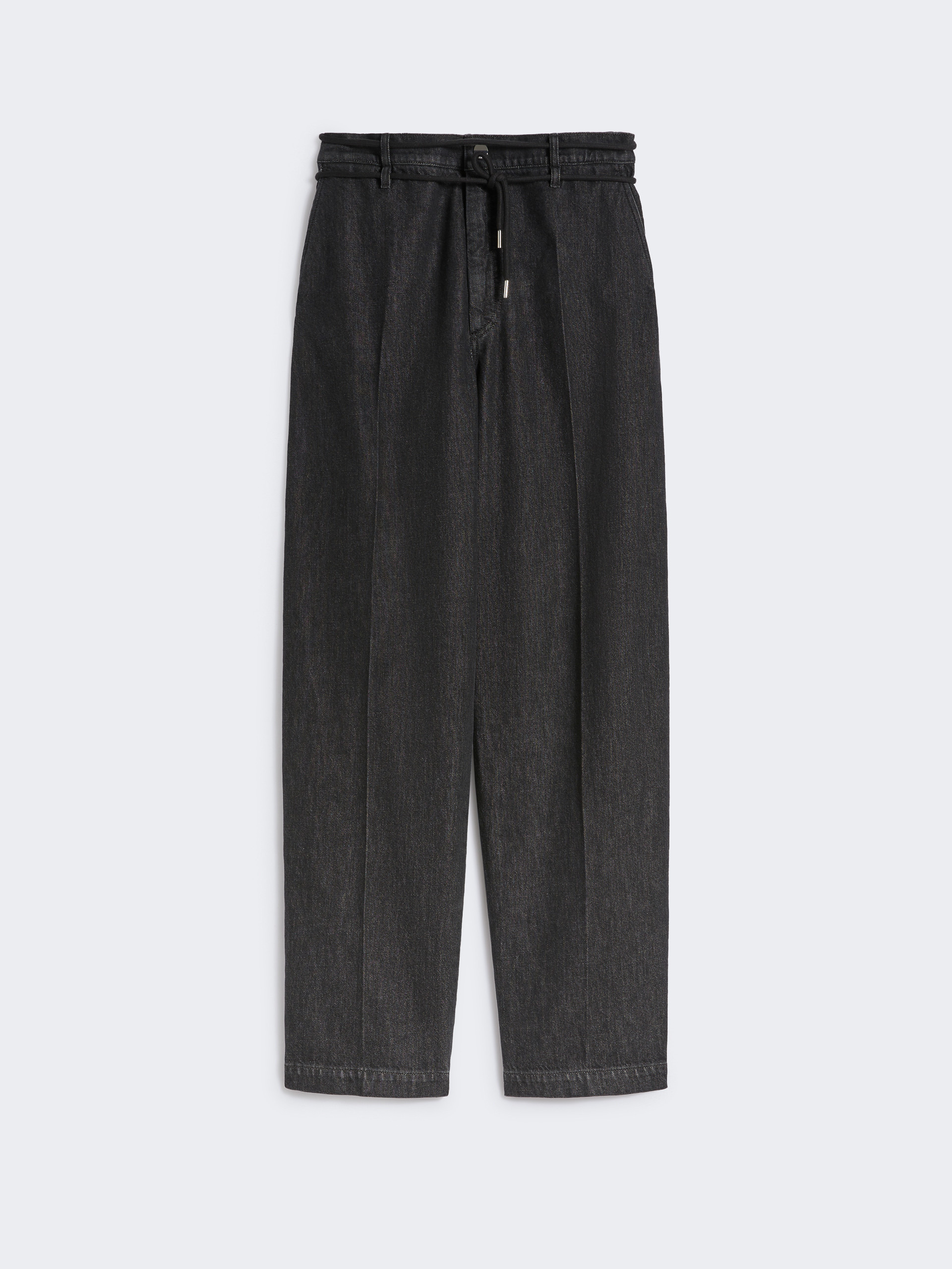 DETAILS Denim with a metropolitan edge, featuring a relaxed leg and low-rise crotch for an easy, laid-back style. The garment features a tubular fabric belt with a double loop, allowing for custom styling. Lightweight and soft black denim jeans with dark clean treatment Straight fit Concealed fastening with zip and metal button Tubular metal belt and elastic insert at the back of the waist Side and back welt pockets Double-loop pattern for inserting the belt at waist level or slightly below Regular fit COMPOSITION AND CARE 100% cotton. Machine wash cold delicate cycle; do not bleach; do not tumble dry; line drying in the shade; cool iron; professionally dry clean perchloroethylene - mild process.; wash the garment while it is fastened.; do not iron the buttons.; remove the belt before washing.; take care when wearing light-coloured clothes or accessories because, with the heat of the body, the denim fabric that comes into contact with them may bleed and stain. be careful while sitting on pale colored surfaces, especially if wet. wash denim items separately and always turned inside out. hang the garment turned inside out by avoiding to expose it to direct sunlight. avoid removing isolated stains. Distributed by Max Mara S.r.l., registered office in Reggio Emilia (Italy), Via Giulia Maramotti 4, 42124 (IT)