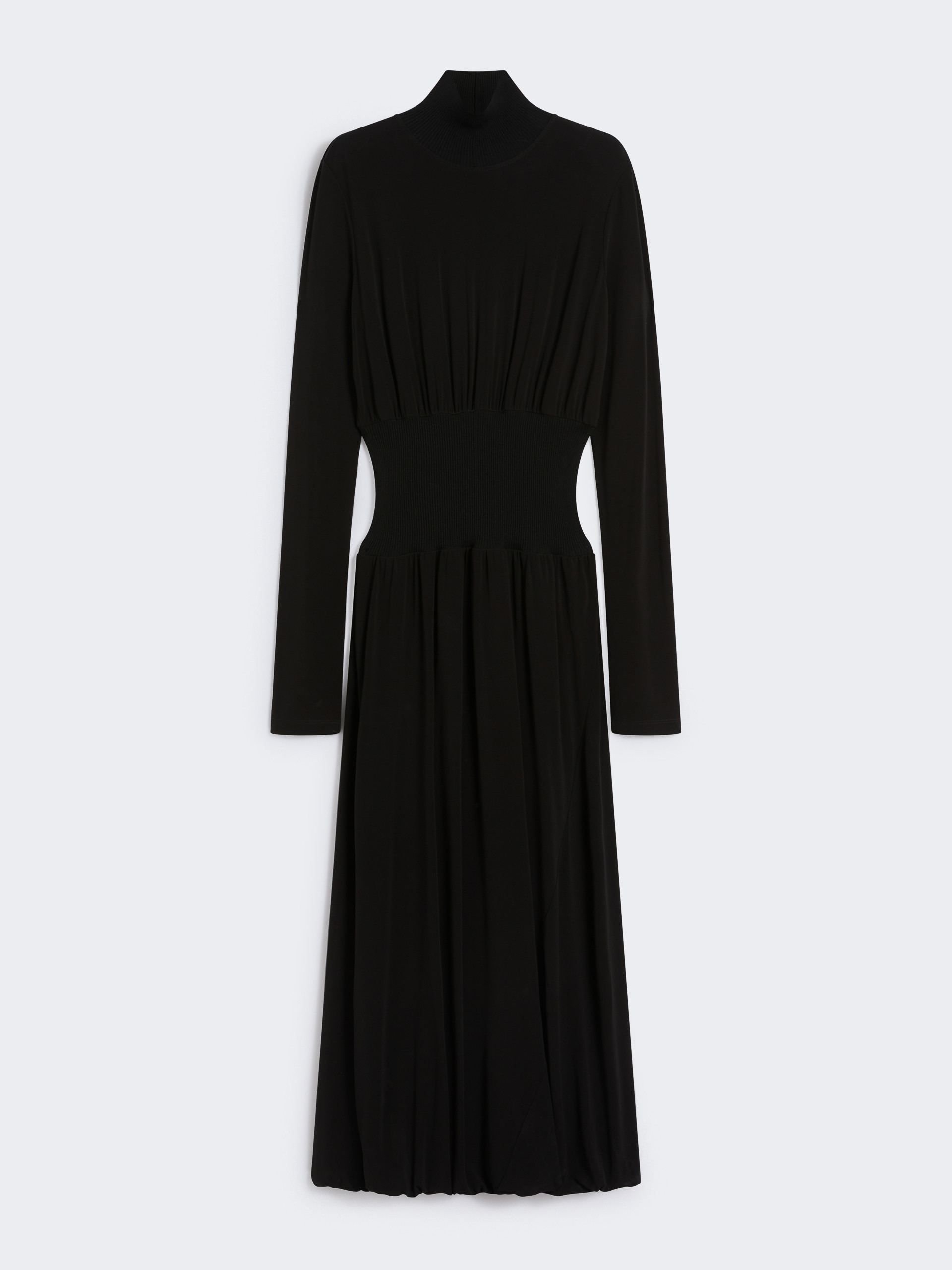 DETAILS Dress featuring an innovative soft jersey design, accented with ribbed inserts that elegantly cinch the waist. Hem with special construction that creates a twist. Stretch viscose blend crepe interlock jersey dress Unstructured fit Polo neck Ribbed viscose knit insert on collar and waist Gathering above and below the insert Hem with twist construction Fitted waist COMPOSITION AND CARE Jersey fabric 1 96% viscose, 4% elastane; jersey fabric 2 47% polyamide, 36% viscose, 14% polyester, 3% elastane; lining 100% polyamide. Hand wash cold (40°c max); do not bleach; do not tumble dry; flat drying in the shade; cool iron; professionally dry clean perchloroethylene - mild process; do not wet clean.; iron with a cloth between.; using neutral detergent.; don’t rub.; turn the articles inside out before washing.; to be ironed on reverse. Distributed by Max Mara S.r.l., registered office in Reggio Emilia (Italy), Via Giulia Maramotti 4, 42124 (IT)