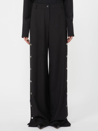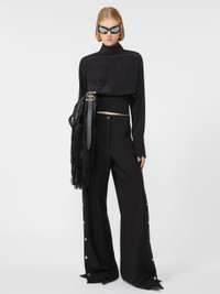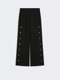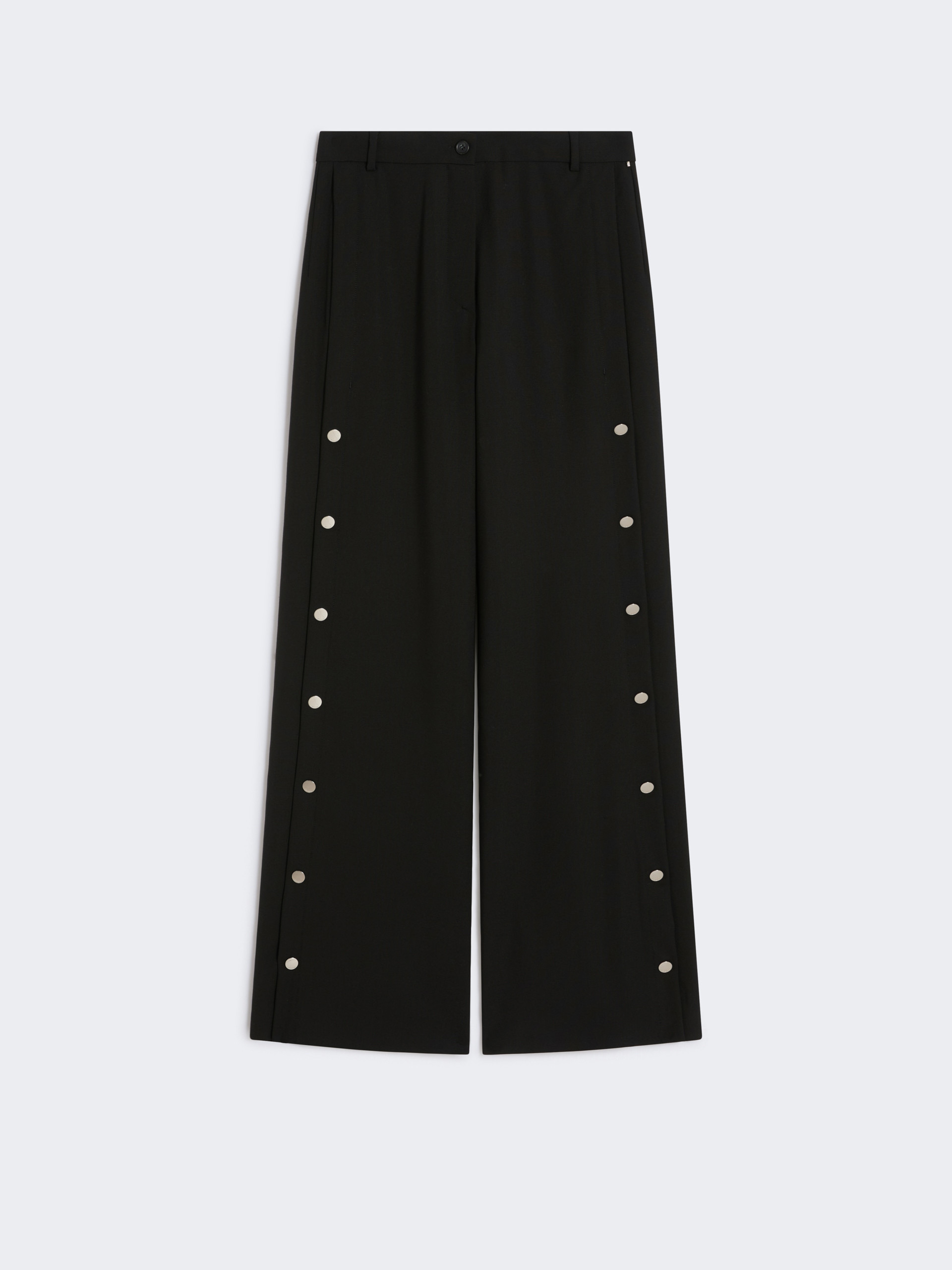DETAILS Trousers in soft stretch wool, with side slits held in place by custom press studs. Opening adjustable as desired. Stretch wool trousers Regular fit with wide leg and slightly low waist Closure with visible horn-effect button and concealed zip High side slits with custom snap buttons Back welt pockets Regular fit COMPOSITION AND CARE 100% virgin wool. Do not wash; do not bleach; do not tumble dry; cool iron; professionally dry clean perchloroethylene - mild process; do not wet clean.; wash the garment while it is fastened.; turn the articles inside out before washing. Distributed by Max Mara S.r.l., registered office in Reggio Emilia (Italy), Via Giulia Maramotti 4, 42124 (IT)