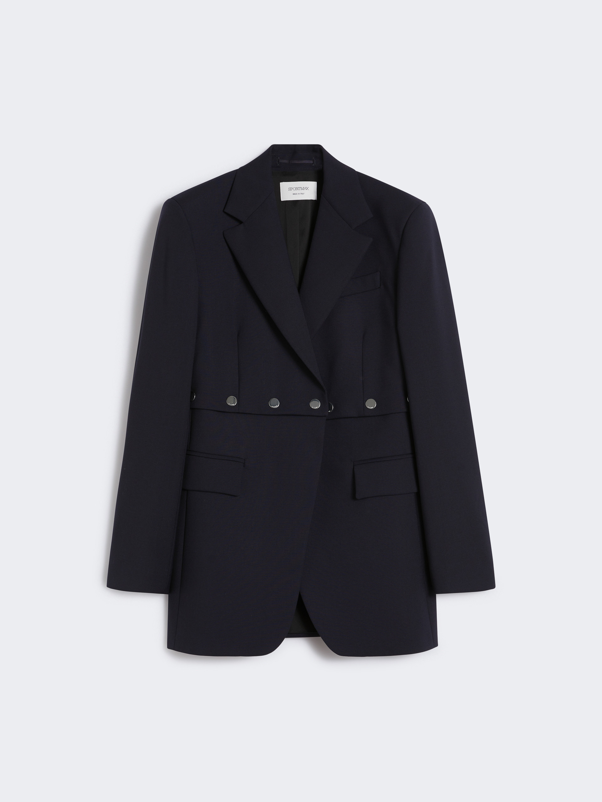 DETAILS Jacket featuring innovative design, with personalized snap buttons that enable the hem to be detached. Structured in its tailoring, it fuses classic elements with avant-garde touches. Tailored stretch wool cloth jacket Regular fit Lapel neckline Detachable construction with custom snap buttons Flapped side pockets Lined Regular fit COMPOSITION AND CARE Fabric 100% virgin wool; lining 70% acetate, 30% polyester; sleeves lining 97% viscose, 3% acetate. Do not wash; do not bleach; do not tumble dry; cool iron; professionally dry clean perchloroethylene - mild process; do not wet clean. Distributed by Max Mara S.r.l., registered office in Reggio Emilia (Italy), Via Giulia Maramotti 4, 42124 (IT)