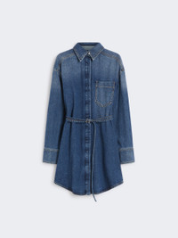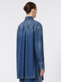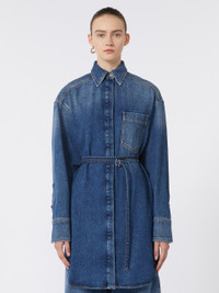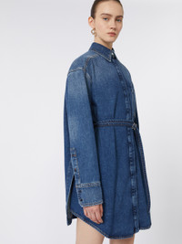 DETAILS Creative construction for the oversize shirt in non-stretch denim: the back features a double-panel construction with a belt that tightens only the lower part while highlighting the silhouette on the front. Wide and straight, it can also be worn as a mini dress. Authentic, oversize non-stretch soft indigo denim shirt with medium vintage treatment. Oversized fit Shirt collar with covered buttoning Belt with personalized S-shaped buckle Rounded hems and contrasting stitching Wide fit COMPOSITION AND CARE 100% cotton. Machine wash cold delicate cycle; do not bleach; do not tumble dry; line drying in the shade; cool iron; professionally dry clean perchloroethylene - mild process.; remove the buckle before washing.; take care when wearing light-coloured clothes or accessories because, with the heat of the body, the indigo fabric , may fade and stain. be careful while sitting on light coloured surfaces, especially if wet. wash garments separately and always turned inside out. hang the garment turned inside out by avoiding to expose it to direct sunlight. avoid removing isolated stains. Distributed by Max Mara S.r.l., registered office in Reggio Emilia (Italy), Via Giulia Maramotti 4, 42124 (IT)