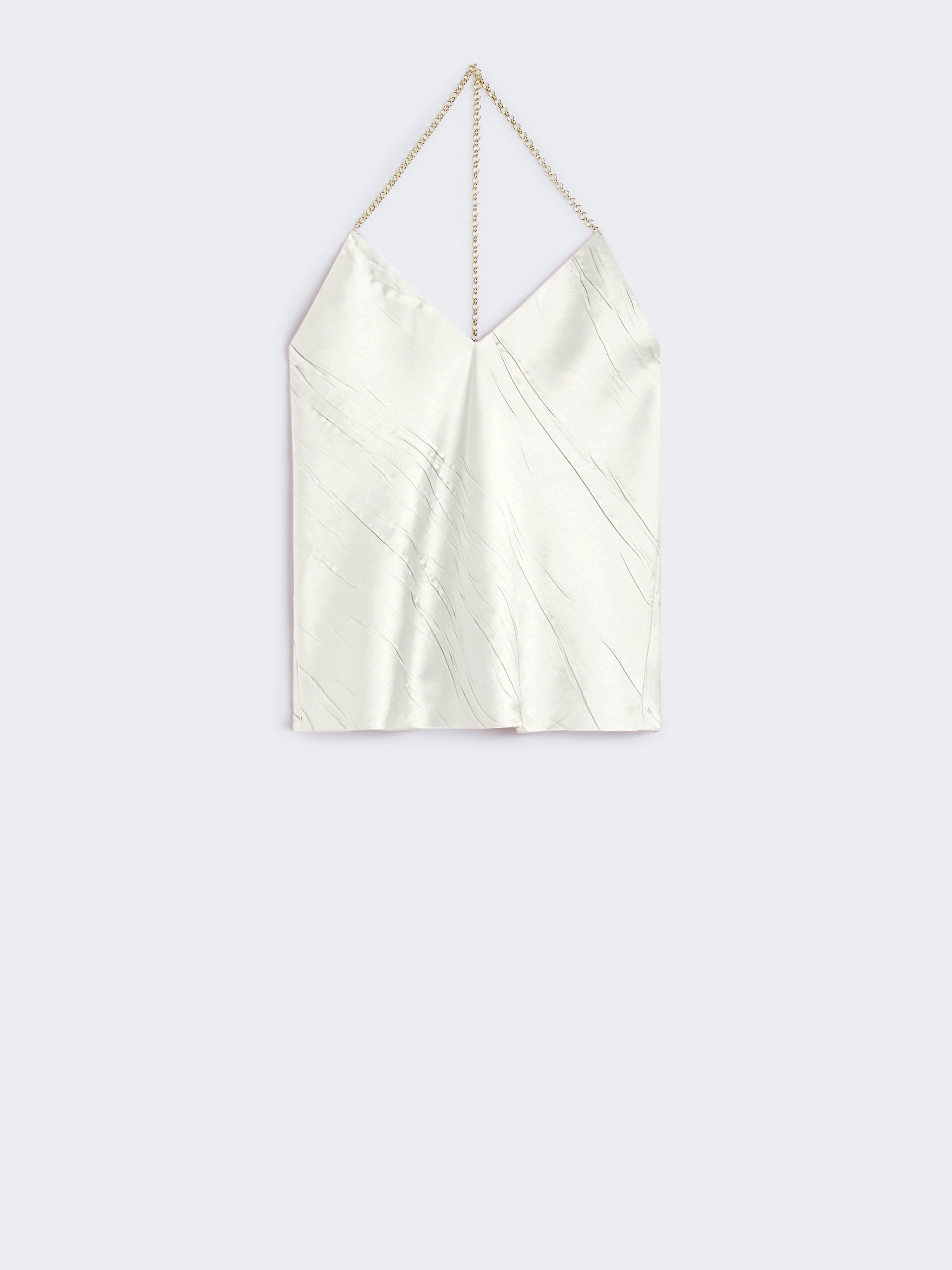 DETAILS Lingerie top with V-neck and metal chain straps that close at the back of the neck. Made of satin coupled with irregular pleating and bias cut for a twill effect. Lingerie top in bonded and pleated technical satin Straight fit V-neck front and straight cut at the back Metal chain straps with S detail Lined Regular fit COMPOSITION AND CARE Fabric 100% polyester; lining 100% polyester. Hand wash cold (40°c max); do not bleach; do not tumble dry; line drying in the shade; do not iron; professionally dry clean perchloroethylene - mild process; do not wet clean.; remove metal parts before washing. Distributed by Max Mara S.r.l., registered office in Reggio Emilia (Italy), Via Giulia Maramotti 4, 42124 (IT)