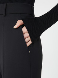DETAILS Tight-fitting trousers with a flared hem, inspired by classic men's tailoring details. Low waist. Stretch wool knit trousers Tight fit with flared line at the hem and low waist Menswear-style hook fastening Customised waistband interior Slant side pockets and back welt pockets Trouser crease front and back Regular fit COMPOSITION AND CARE 95% virgin wool, 5% elastane. Do not wash; do not bleach; do not tumble dry; cool iron; professionally dry clean perchloroethylene - mild process; do not wet clean. Distributed by Max Mara S.r.l., registered office in Reggio Emilia (Italy), Via Giulia Maramotti 4, 42124 (IT)