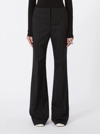 DETAILS Flared line and low waist define these stretch wool gabardine trousers with a pinstripe pattern. The pressed crease visually elongates the silhouette. - Trousers in stretch technical wool gabardine with pinstripe pattern - Low waist without waistband - Slanted side pockets and welt back pockets - Front and back pressed crease - Regular fit COMPOSITION AND CARE 54% virgin wool, 44% polyester, 2% elastane. Do not wash; do not bleach; do not tumble dry; cool iron; professionally dry clean perchloroethylene - mild process; do not wet clean. Distributed by Max Mara S.r.l., registered office in Reggio Emilia (Italy), Via Giulia Maramotti 4, 42124 (IT) Collection: Sportmax Product code: 2131056106004 - SPXVISINO