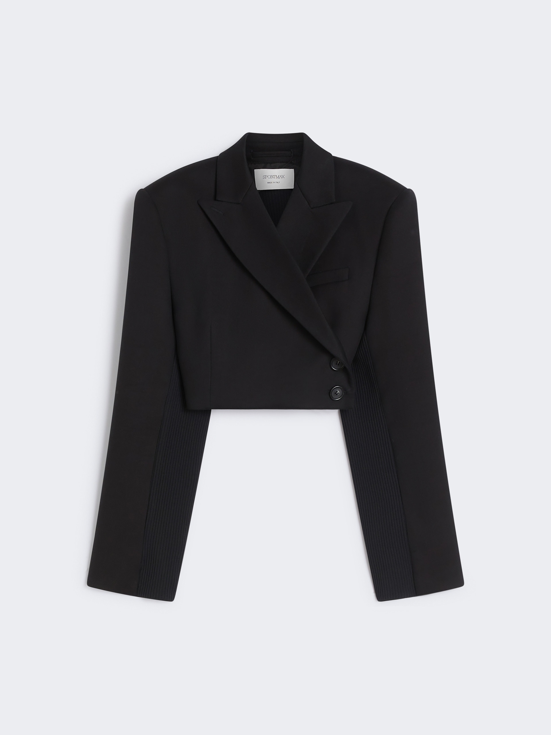 DETAILS Short tailored blazer with double-breasted construction, completed by ribbed knit back and underarm. The lines are clean, with visible side buttons. Short blazer in double washed cotton and viscose cady, with ribbed knit details Collar with peak lapels Double-breasted two side buttons Back and under sleeves in ribbed knit Semi-lined garment. Fitted COMPOSITION AND CARE Fabric 53% cotton, 47% viscose; jersey fabric 100% polyamide; lining 70% acetate, 30% polyester; sleeves lining 97% viscose, 3% acetate. Do not wash; do not bleach; do not tumble dry; cool iron; professionally dry clean perchloroethylene - mild process; do not wet clean.; put this item into a string bag before washing it.; wash the garment while it is fastened. Distributed by Max Mara S.r.l., registered office in Reggio Emilia (Italy), Via Giulia Maramotti 4, 42124 (IT)