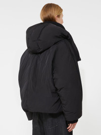DETAILS Soft-volume, waist-length down jacket. Made of water-repellent technical fabric, it features goose down padding and a removable hood that closes with snap buttons. Water-repellent technical fabric down jacket with crinkle effect Loose fit Ribbed knit stand-up collar and detachable hood Front zip opening Flapped side pockets Ribbed knit collar and cuffs Wide fit COMPOSITION AND CARE Fabric 100% polyamide; lining 100% polyamide; with quilting in 100% polyester; with knitted details 100% polyester; with quilting virgin down. Machine wash cold delicate cycle; do not bleach; do not tumble dry; line drying in the shade; cool iron; professionally dry clean perchloroethylene - mild process.; put this item into a string bag before washing it.; wash the garment while it is fastened.; turn the articles inside out before washing.; contains non-textile parts of animal origin. Distributed by Max Mara S.r.l., registered office in Reggio Emilia (Italy), Via Giulia Maramotti 4, 42124 (IT)