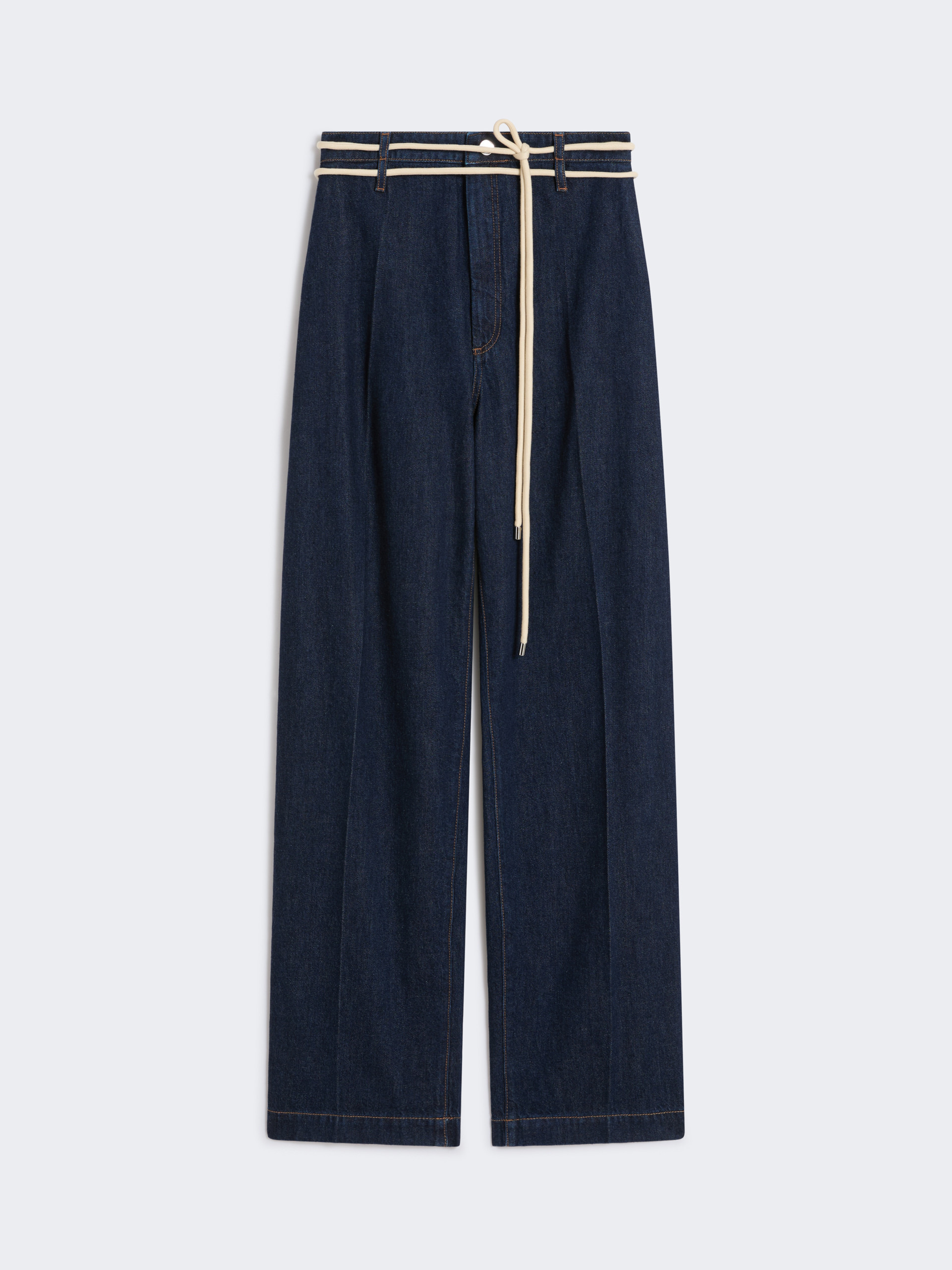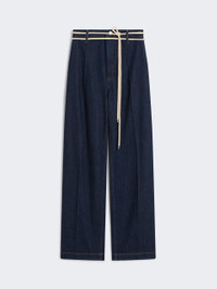 DETAILS Hybrid design trousers, mixing men's tailored construction with jogger details. Crafted from lightweight denim with a low rise and crotch. Lightweight and soft blue denim trousers with clean dark treatment Straight fit with low waist and crotch Double-wrap drawstring closure at the waist, custom snap button and elastic insert on the back Tobacco-coloured contrast stitching Trouser crease front and back Slant side pockets and back welt pockets Double-loop pattern for inserting the belt at waist level or slightly below Regular fit COMPOSITION AND CARE 100% cotton. Machine wash cold delicate cycle; do not bleach; do not tumble dry; line drying in the shade; cool iron; professionally dry clean perchloroethylene - mild process.; wash the garment while it is fastened.; do not iron the buttons.; remove the belt before washing.; take care when wearing light-coloured clothes or accessories because, with the heat of the body, the indigo fabric , may fade and stain. be careful while sitting on light coloured surfaces, especially if wet. wash garments separately and always turned inside out. hang the garment turned inside out by avoiding to expose it to direct sunlight. avoid removing isolated stains. Distributed by Max Mara S.r.l., registered office in Reggio Emilia (Italy), Via Giulia Maramotti 4, 42124 (IT)