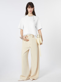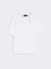 DETAILS T-shirt with an original construction, and a special neckline that allows for the insertion of a necklace with a personalized pendant. Pure cotton jersey T-shirt Straight fit. Rounded neckline with original construction Ribbed details along the edges Fit COMPOSITION AND CARE Jersey fabric 100% cotton; - exclusive of accessories. Machine wash cold delicate cycle; do not bleach; do not tumble dry; flat drying in the shade; cool iron; professionally dry clean perchloroethylene - mild process; professional wet cleaning - very mild process.; iron with a cloth between.; using neutral detergent.; before cleaning the style remove the accessories. Distributed by Max Mara S.r.l., registered office in Reggio Emilia (Italy), Via Giulia Maramotti 4, 42124 (IT)
