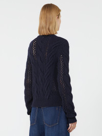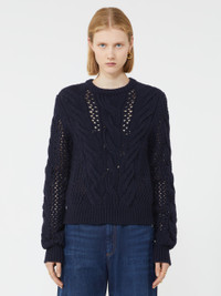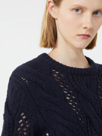 DETAILS Soft, warm wool blend yarn jumper with openwork cable knit on the body and sleeves. Ribbed details on the hem and cuffs Wool-blend jumper Regular fit Rounded neckline Cable knit and openwork stitch motif on the body and sleeves Ribbed hem and cuffs Regular fit COMPOSITION AND CARE 70% wool, 30% polyamide. Do not wash; do not bleach; do not tumble dry; cool iron; professionally dry clean perchloroethylene - mild process; do not wet clean.; iron with a cloth between. Distributed by Max Mara S.r.l., registered office in Reggio Emilia (Italy), Via Giulia Maramotti 4, 42124 (IT)