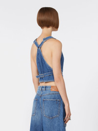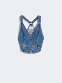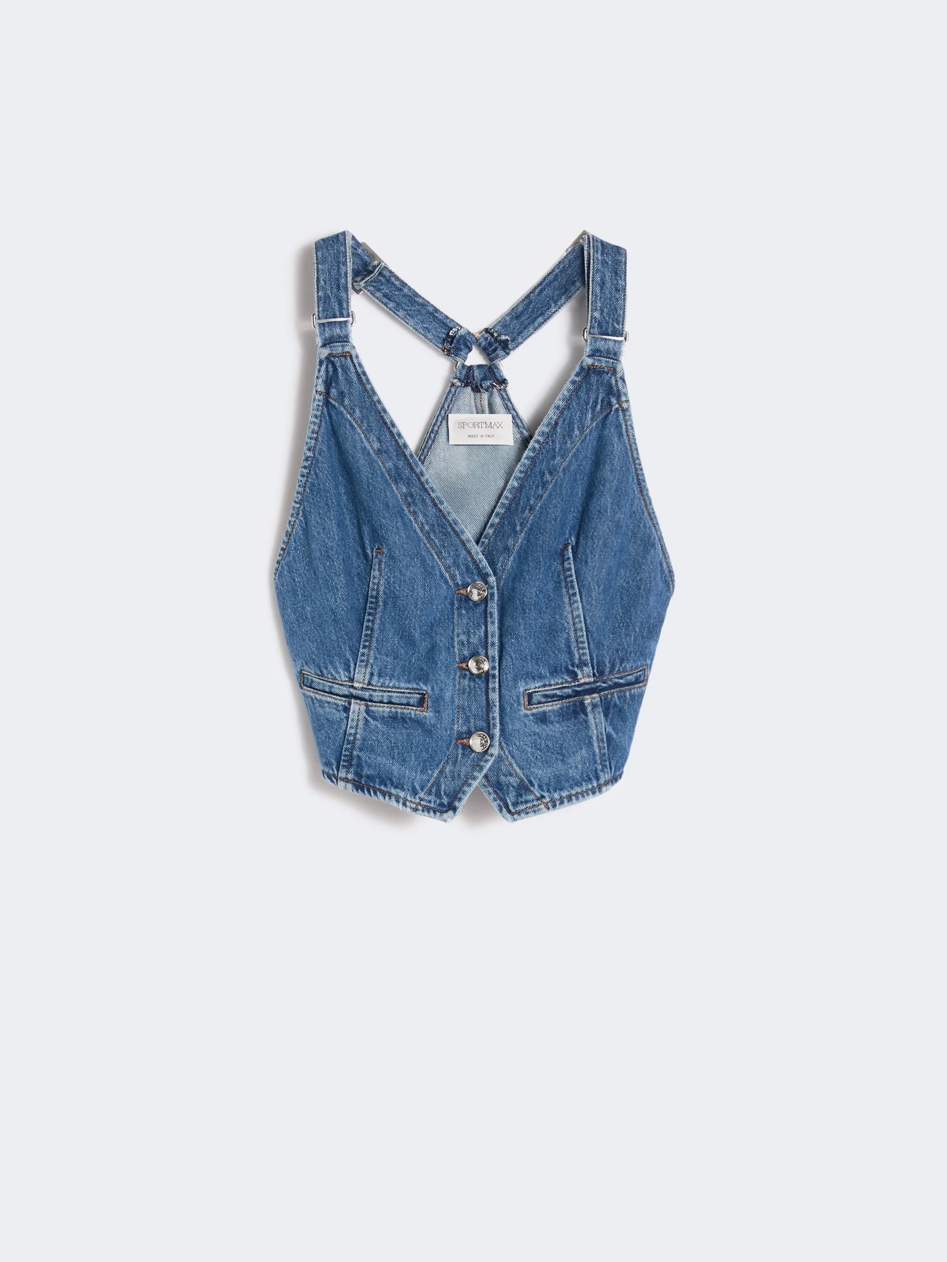 DETAILS A gilet to be worn as a top, on its own or as part of a layered styling: this new slim-fit denim model boasts a V-neck front that meets on the back. The back strap can be used to adjust the waist fit. - Authentic non-stretch indigo denim gilet, with medium vintage treatment - V-neck with wide shoulder straps and metal ring adjuster motif - Welt pockets and branded metal tack buttons - Contrasting tobacco-coloured topstitching - Slim fit COMPOSITION AND CARE 100% cotton. Machine wash cold delicate cycle; do not bleach; do not tumble dry; line drying in the shade; cool iron; professionally dry clean perchloroethylene - mild process.; take care when wearing light-coloured clothes or accessories because, with the heat of the body, the indigo fabric , may fade and stain. be careful while sitting on light coloured surfaces, especially if wet. wash garments separately and always turned inside out. hang the garment turned inside out by avoiding to expose it to direct sunlight. avoid removing isolated stains. Distributed by Max Mara S.r.l., registered office in Reggio Emilia (Italy), Via Giulia Maramotti 4, 42124 (IT) Collection: Sportmax Product code: 2151016206005 - SPXDAMA