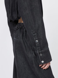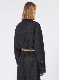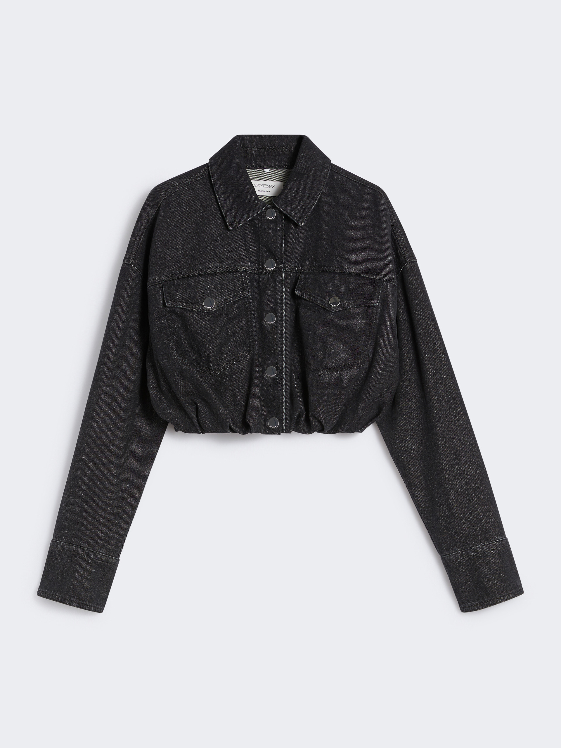 DETAILS Light and soft black denim jacket with volume emphasized by the elasticated insert at the hem. The stitching runs along all the structured cuts and highlights the front pockets. Soft, dark indigo denim jacket, garment-treated for a dark, clean effect Shirt collar Closure with customised metal buttons Pockets with yoke at the front Matching stitching all over the garment Gathered detail at the garment hem Regular fit COMPOSITION AND CARE 100% cotton. Machine wash cold delicate cycle; do not bleach; do not tumble dry; line drying in the shade; cool iron; professionally dry clean perchloroethylene - mild process.; wash the garment while it is fastened.; do not iron the buttons.; take care when wearing light-coloured clothes or accessories because, with the heat of the body, the denim fabric that comes into contact with them may bleed and stain. be careful while sitting on pale colored surfaces, especially if wet. wash denim items separately and always turned inside out. hang the garment turned inside out by avoiding to expose it to direct sunlight. avoid removing isolated stains. Distributed by Max Mara S.r.l., registered office in Reggio Emilia (Italy), Via Giulia Maramotti 4, 42124 (IT)