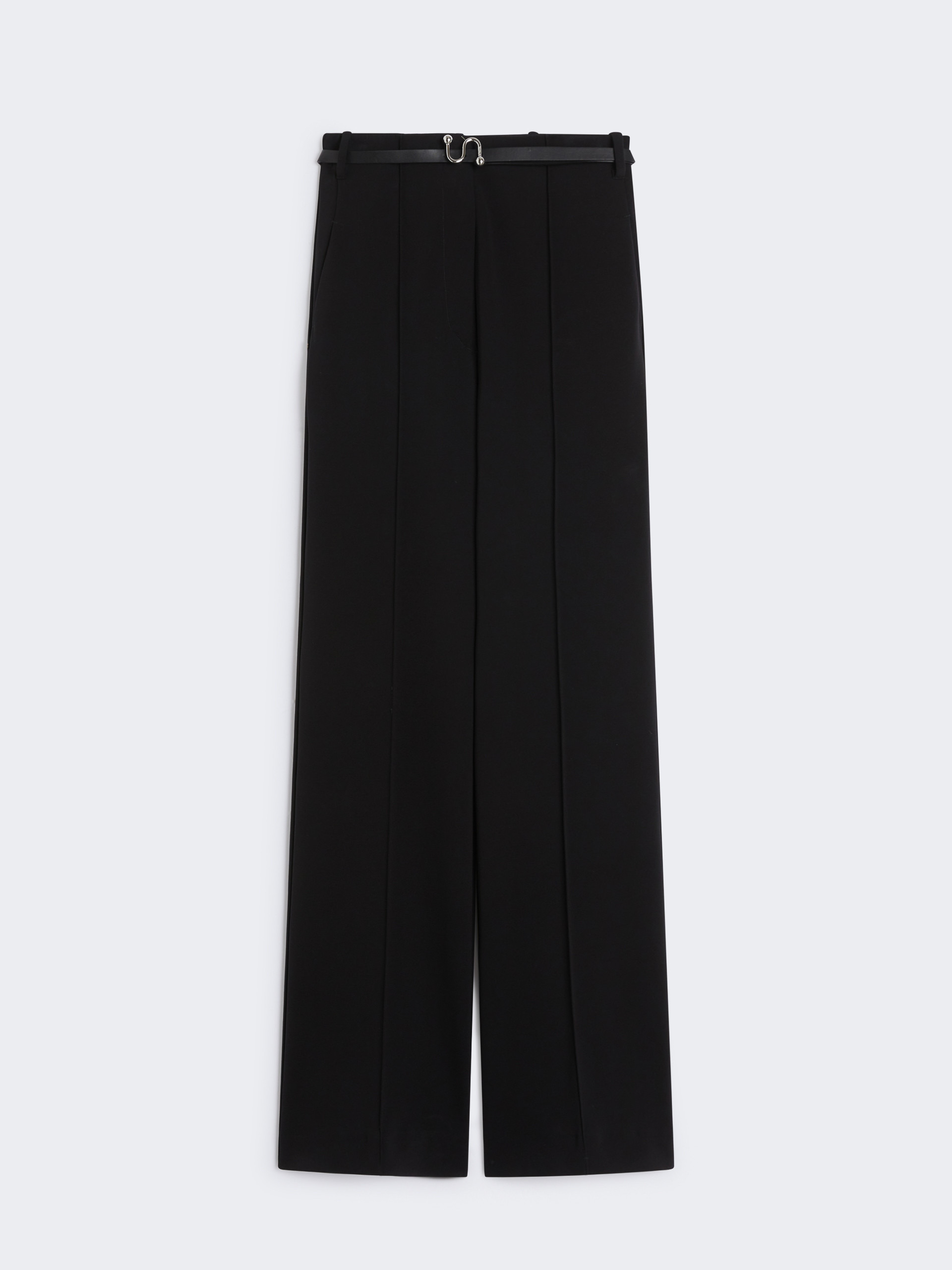 DETAILS Trousers made of soft and comfortable crepe stitch fabric. The model features a high waist with a fabric belt and S-shaped metal buckle. Ribbing on the front and a trouser pleat on the back. Stretch viscose blend trousers Slightly flared line at the hem, with high waist Menswear-style hook fastening Belt in matching fabric with S-shaped metal buckle. Ribbing on the front and trouser crease on the back Regular fit COMPOSITION AND CARE 70% viscose, 25% polyamide, 5% elastane. Do not wash; do not bleach; do not tumble dry; cool iron; professionally dry clean perchloroethylene - mild process; do not wet clean.; iron with a cloth between.; before cleaning the style remove the accessories.; remove the belt before washing. Distributed by Max Mara S.r.l., registered office in Reggio Emilia (Italy), Via Giulia Maramotti 4, 42124 (IT)