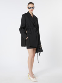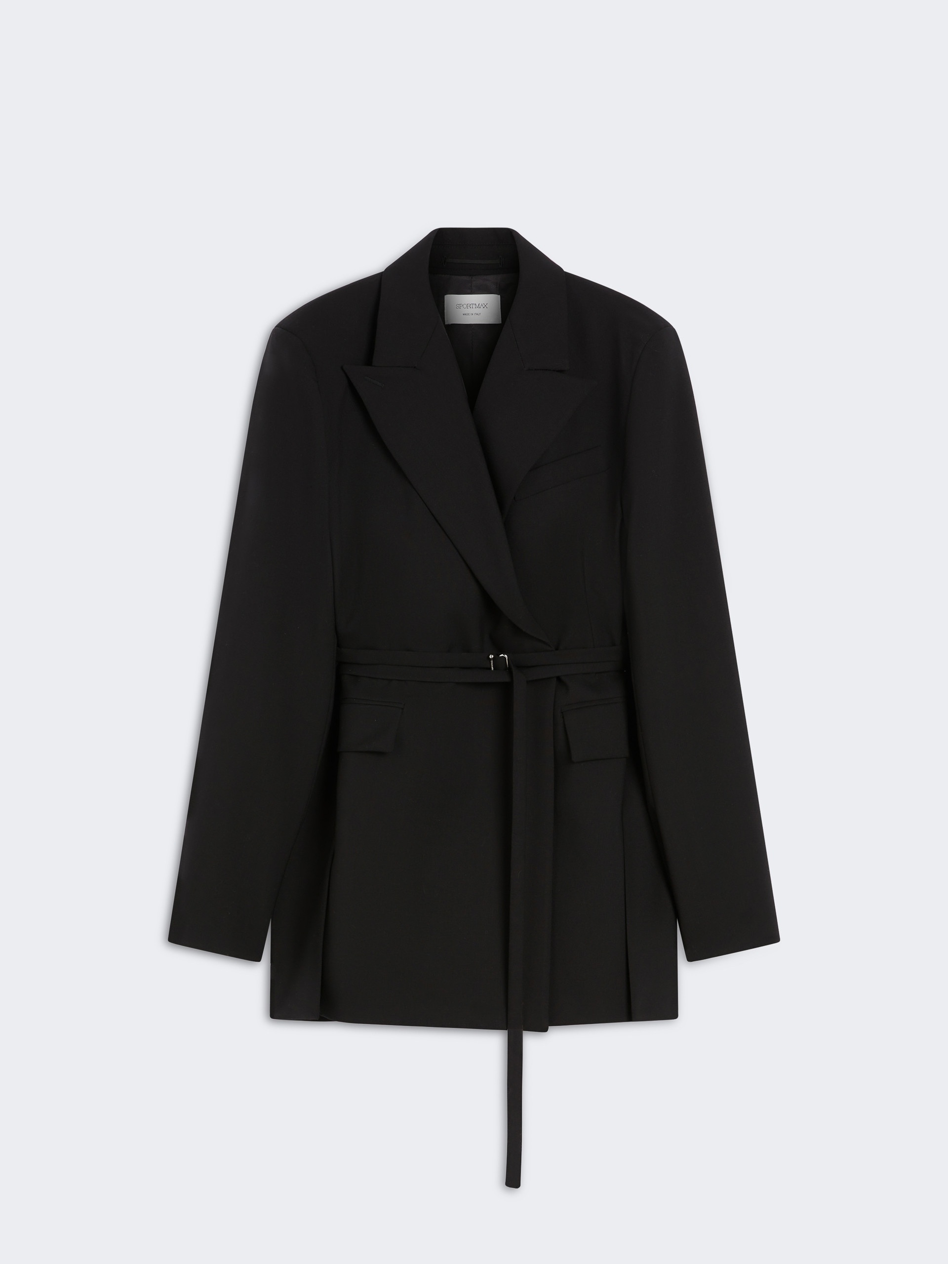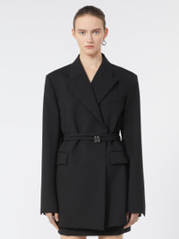 DETAILS Long blazer with tailored construction, deep slits along the sides and detached back. The double-wrap belt cinches the waist only at the front. Concealed buttoning. Long tailored blazer in pure yarn-dyed wool canvas Collar with peak lapels Double-breasted fastening with hidden snap buttons and double-wrap belt with S-buckle Lined Regular fit COMPOSITION AND CARE Fabric 100% virgin wool; lining 50% acetate, 50% viscose; sleeves lining 97% viscose, 3% acetate. Do not wash; do not bleach; do not tumble dry; cool iron; professionally dry clean perchloroethylene - mild process; do not wet clean.; do not iron the buttons.; remove the buckle before washing. Distributed by Max Mara S.r.l., registered office in Reggio Emilia (Italy), Via Giulia Maramotti 4, 42124 (IT)