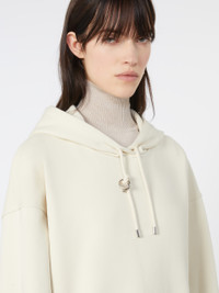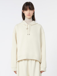 DETAILS Stretch cotton blend varsity sweatshirt with jersey-lined hood. The drawstring tips feature a customization with an S-shaped accessory woven into the drawstring. Stretch cotton blend varsity sweatshirt with jersey-lined hood Regular and soft fit on the torso Model with hood and drawstring with custom metal tips Rib-knit cuffs and hem. Rubberized logo inside the cuff Jersey lined hood Fit COMPOSITION AND CARE Jersey fabric 87% cotton, 13% elastomultiester; lining 100% cotton. Machine wash cold delicate cycle; do not bleach; do not tumble dry; flat drying in the shade; cool iron; do not dry clean; professional wet cleaning - very mild process.; iron with a cloth between.; using neutral detergent.; protect accessories before washing.; turn the articles inside out before washing.; to be ironed on reverse. Distributed by Max Mara S.r.l., registered office in Reggio Emilia (Italy), Via Giulia Maramotti 4, 42124 (IT)