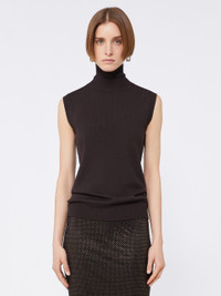 DETAILS Sleeveless turtleneck in fine pure wool yarn, with high neck and dropped details along the neckline and armhole. Edges and hem of garment made of ribbed knit. Pure wool cardigan Soft fit with feminine line High neck Edges and hem of garment in ribbed knit. Dropped details Regular fit COMPOSITION AND CARE 100% virgin wool. Hand wash cold (40°c max); do not bleach; do not tumble dry; flat drying in the shade; cool iron; professionally dry clean perchloroethylene - mild process; do not wet clean.; iron with a cloth between.; using neutral detergent. Distributed by Max Mara S.r.l., registered office in Reggio Emilia (Italy), Via Giulia Maramotti 4, 42124 (IT)
