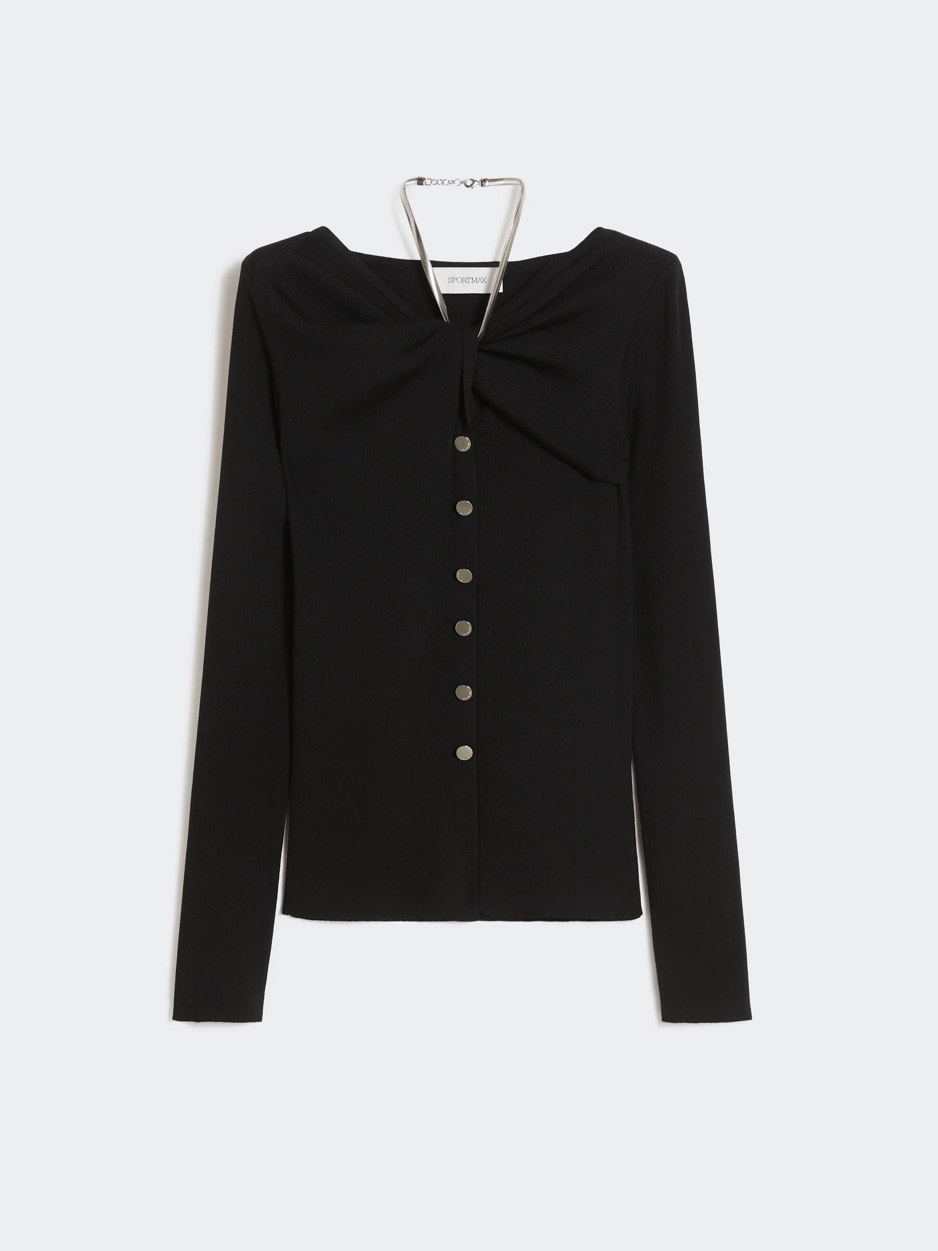 DETAILS New jumper, streamlined on the body, with rounded neckline and metal chain detail on the front neckline. Cardigan-style buttoning that opens from the bust down. - Pure virgin wool jumper - Rounded neckline with chain inserted on the front - Closure with customised metal buttons - Functional buttons from the bust down - Regular fit COMPOSITION AND CARE Knitted fabric 100% virgin wool; - exclusive of accessories. Hand wash cold (40°c max); do not bleach; do not tumble dry; flat drying in the shade; cool iron; professionally dry clean perchloroethylene - mild process; do not wet clean.; iron with a cloth between.; before cleaning the style remove the accessories.; using neutral detergent.; protect buttons before washing. Distributed by Max Mara S.r.l., registered office in Reggio Emilia (Italy), Via Giulia Maramotti 4, 42124 (IT) Collection: Sportmax Product code: 2361046106005 - SPXTROFEO