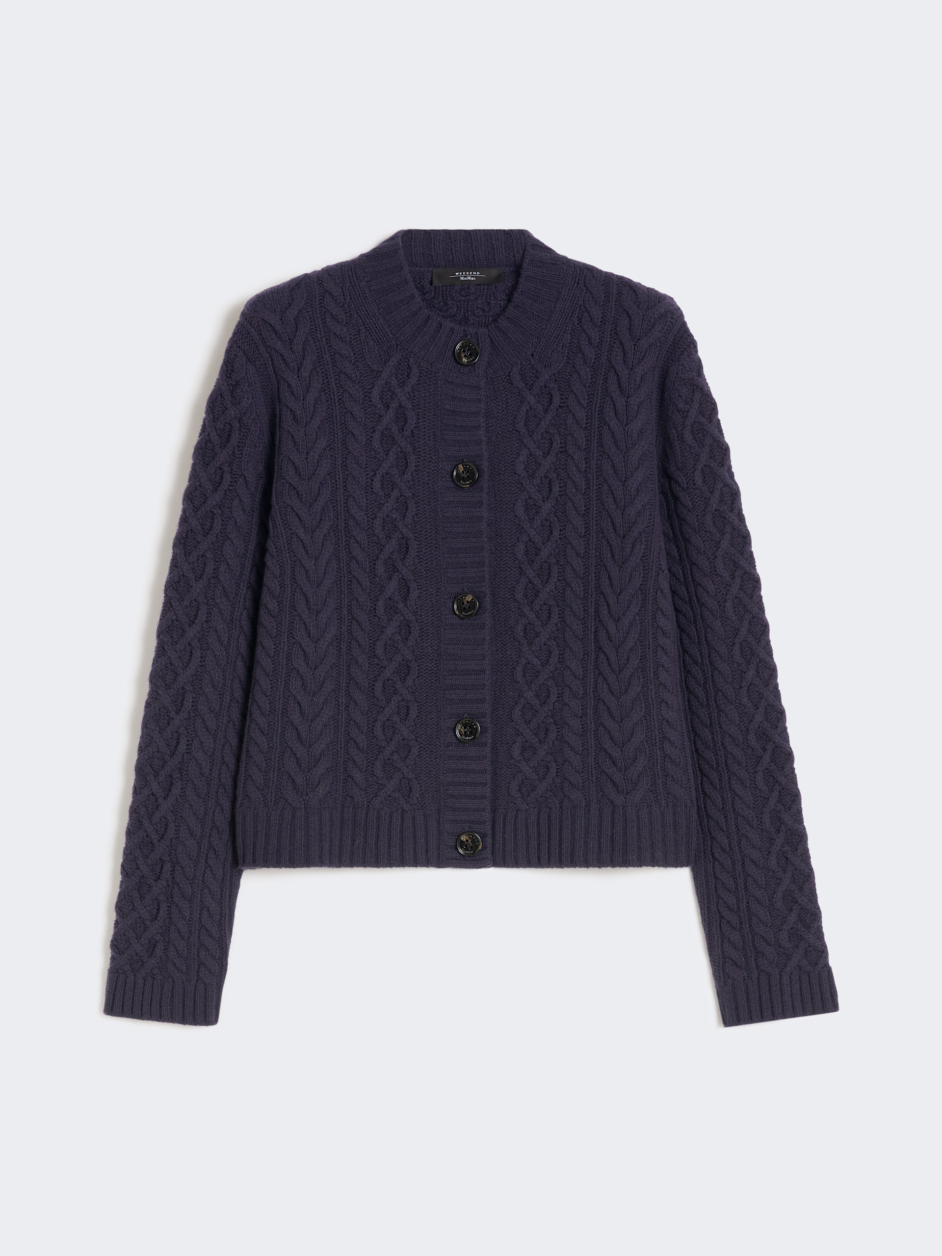 DETAILS Cardigan embellished with an Aran-inspired cable knit. Pure wool yarn cardigan Regular fit Crew neck Long set-in sleeves Button fastening at the front Ribbed trim COMPOSITION AND CARE 100% virgin wool. Hand wash cold (40°c max); do not bleach; do not tumble dry; flat drying in the shade; cool iron; professionally dry clean perchloroethylene - mild process; do not wet clean.; iron with a cloth between.; using neutral detergent. Distributed by Max Mara S.r.l., registered office in Reggio Emilia (Italy), Via Giulia Maramotti 4, 42124 (IT)
