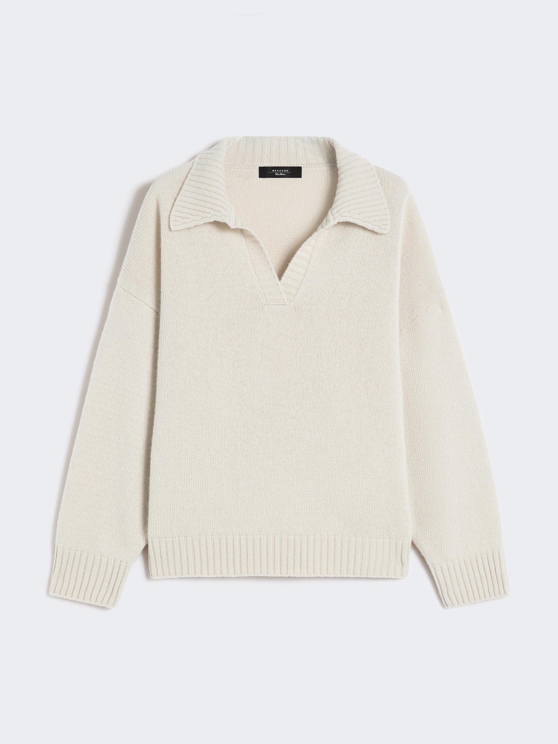 DETAILS Polo jumper with classic pointed collar and open V-neckline front. Polo shirt in plain-knit pure wool Medium length, relaxed fit Long sleeves with dropped shoulders Ribbed edges COMPOSITION AND CARE 100% virgin wool. Hand wash cold (40°c max); do not bleach; do not tumble dry; flat drying in the shade; cool iron; professionally dry clean perchloroethylene - mild process; do not wet clean.; iron with a cloth between.; using neutral detergent. Distributed by Max Mara S.r.l., registered office in Reggio Emilia (Italy), Via Giulia Maramotti 4, 42124 (IT)