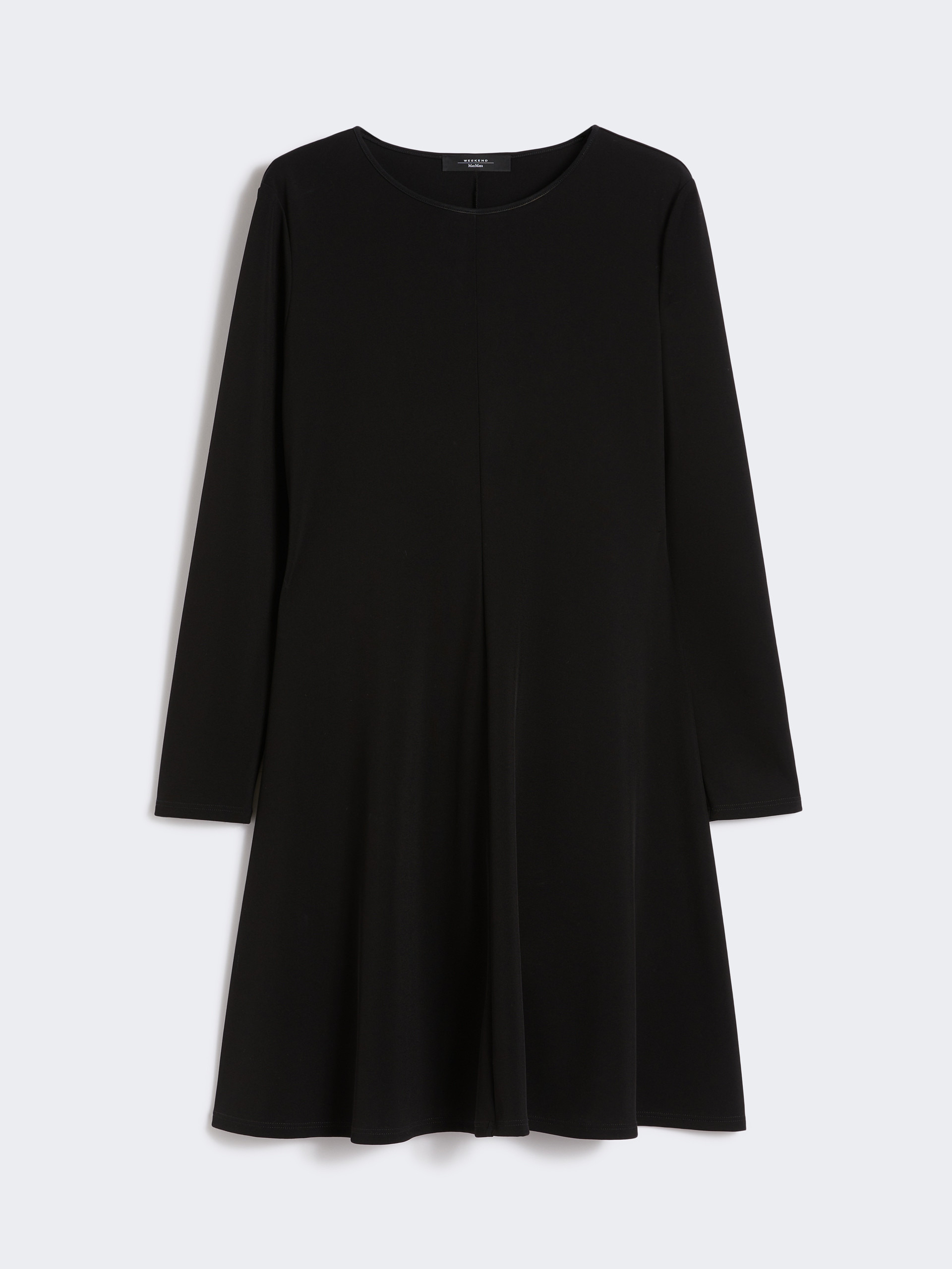 DETAILS Short dress with a fit and flare silhouette. Fitted and slightly flared at the hem. Fluid jersey dress Fitted lines, flared at the hem Boat neck Long set-in sleeves Unlined COMPOSITION AND CARE 56% triacetate, 44% polyester. Machine wash cold delicate cycle; do not bleach; do not tumble dry; flat drying in the shade; cool iron; professionally dry clean perchloroethylene - mild process; professional wet cleaning - very mild process.; iron with a cloth between.; using neutral detergent.; turn the articles inside out before washing.; to be ironed on reverse. Distributed by Max Mara S.r.l., registered office in Reggio Emilia (Italy), Via Giulia Maramotti 4, 42124 (IT)