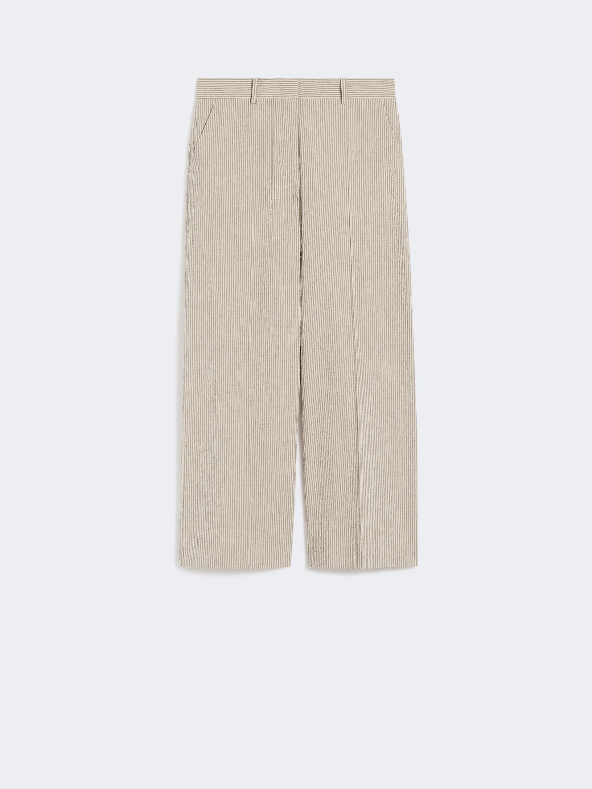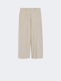 DETAILS Trousers cropped at the ankle, featuring a wide-leg silhouette. - Regular fit - Striped linen and cotton seersucker trousers - Fastening with a wide waistband tab, zip fly and small hook - Slant pockets at the sides - Welt pockets with button at the back - Belt loops at the waist - Trouser crease - Stitched darts on the back waist COMPOSITION AND CARE 73% cotton, 26% flaxlinen, 1% elastane. Do not wash; do not bleach; do not tumble dry; cool iron; professionally dry clean perchloroethylene - mild process; do not wet clean. Distributed by Max Mara S.r.l., registered office in Reggio Emilia (Italy), Via Giulia Maramotti 4, 42124 (IT) Collection: Weekend Max Mara Product code: 5131066206006 - WKDMARINA