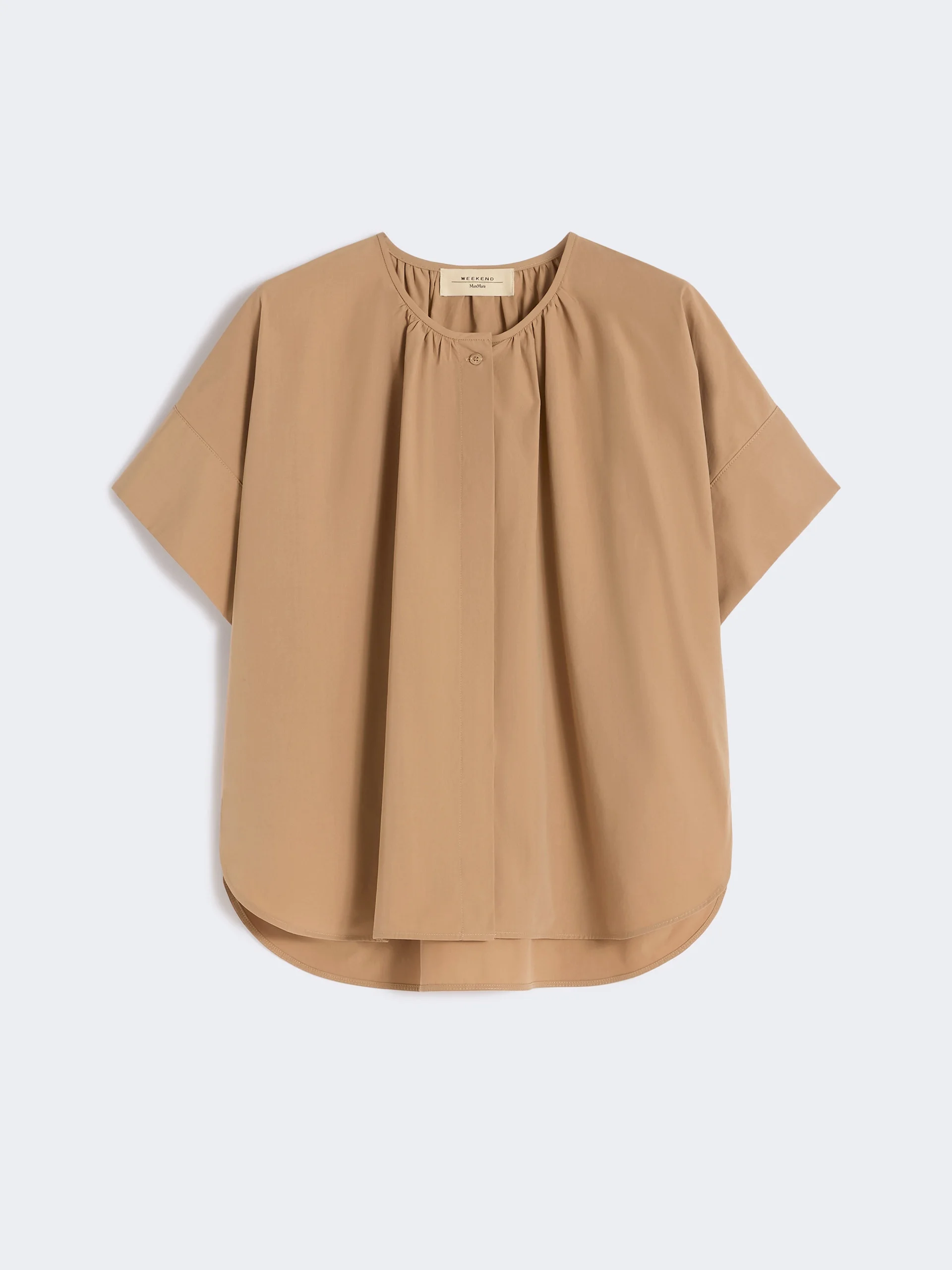 DETAILS Short-sleeved shirt featuring a gathered motif on the front and back of the neck. - Oversized fit - Pure cotton poplin shirt - Crew neck - Short cap sleeves - Concealed front closure with visible top button - Rounded slits at the hem COMPOSITION AND CARE 100% cotton. Machine wash cold delicate cycle; do not bleach; do not tumble dry; line drying in the shade; cool iron; professionally dry clean perchloroethylene - mild process.; wash the garment while it is fastened.; wash separately.; turn the articles inside out before washing.; contains non-textile parts of animal origin. Distributed by Max Mara S.r.l., registered office in Reggio Emilia (Italy), Via Giulia Maramotti 4, 42124 (IT) Collection: Weekend Max Mara Product code: 5111176206010 - WKDEDUCATA