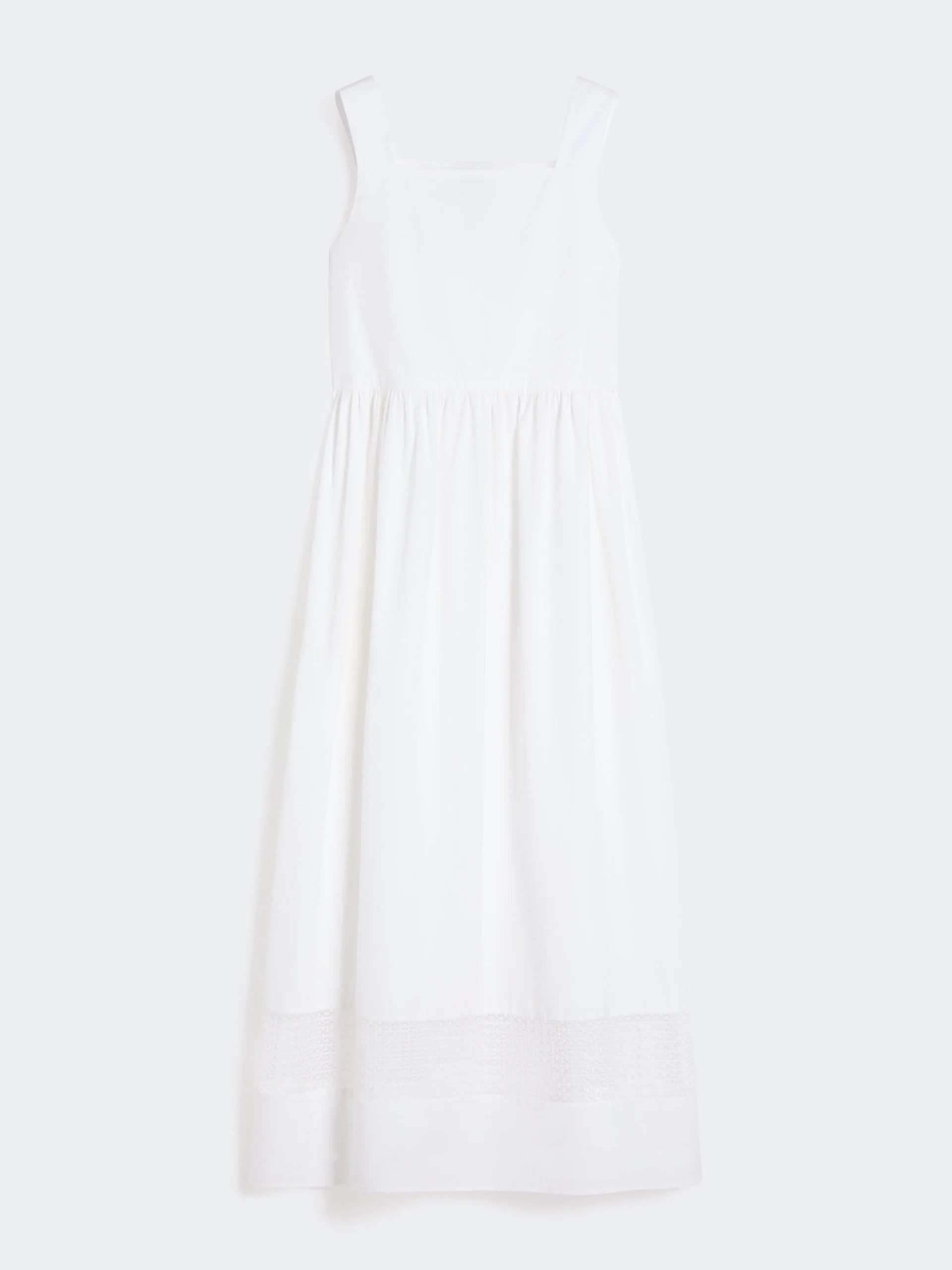 DETAILS Long, sleeveless dress with a fit-and-flare silhouette and lace inserts at the hem. - Regular fit - Pure cotton-poplin dress - Straight neckline front and back - Wide shoulder straps - Concealed zip fastening on the left side - Gathered waist seam - Lined COMPOSITION AND CARE Fabric 100% cotton; lining 100% cotton; lace in 100% polyester. Hand wash cold (40°c max); do not bleach; do not tumble dry; line drying in the shade; cool iron; professionally dry clean perchloroethylene - mild process; do not wet clean. Distributed by Max Mara S.r.l., registered office in Reggio Emilia (Italy), Via Giulia Maramotti 4, 42124 (IT) Collection: Weekend Max Mara Product code: 5221086206005 - WKDGOLA