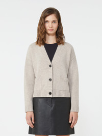 DETAILS Loose-fitting cropped cardigan. Pure wool plain-knit cardigan V neck Long sleeves with dropped shoulders Three-button front fastening Pockets at the front Ribbed edges COMPOSITION AND CARE 100% virgin wool. Hand wash cold (40°c max); do not bleach; do not tumble dry; flat drying in the shade; cool iron; professionally dry clean perchloroethylene - mild process; do not wet clean.; iron with a cloth between.; using neutral detergent. Distributed by Max Mara S.r.l., registered office in Reggio Emilia (Italy), Via Giulia Maramotti 4, 42124 (IT)