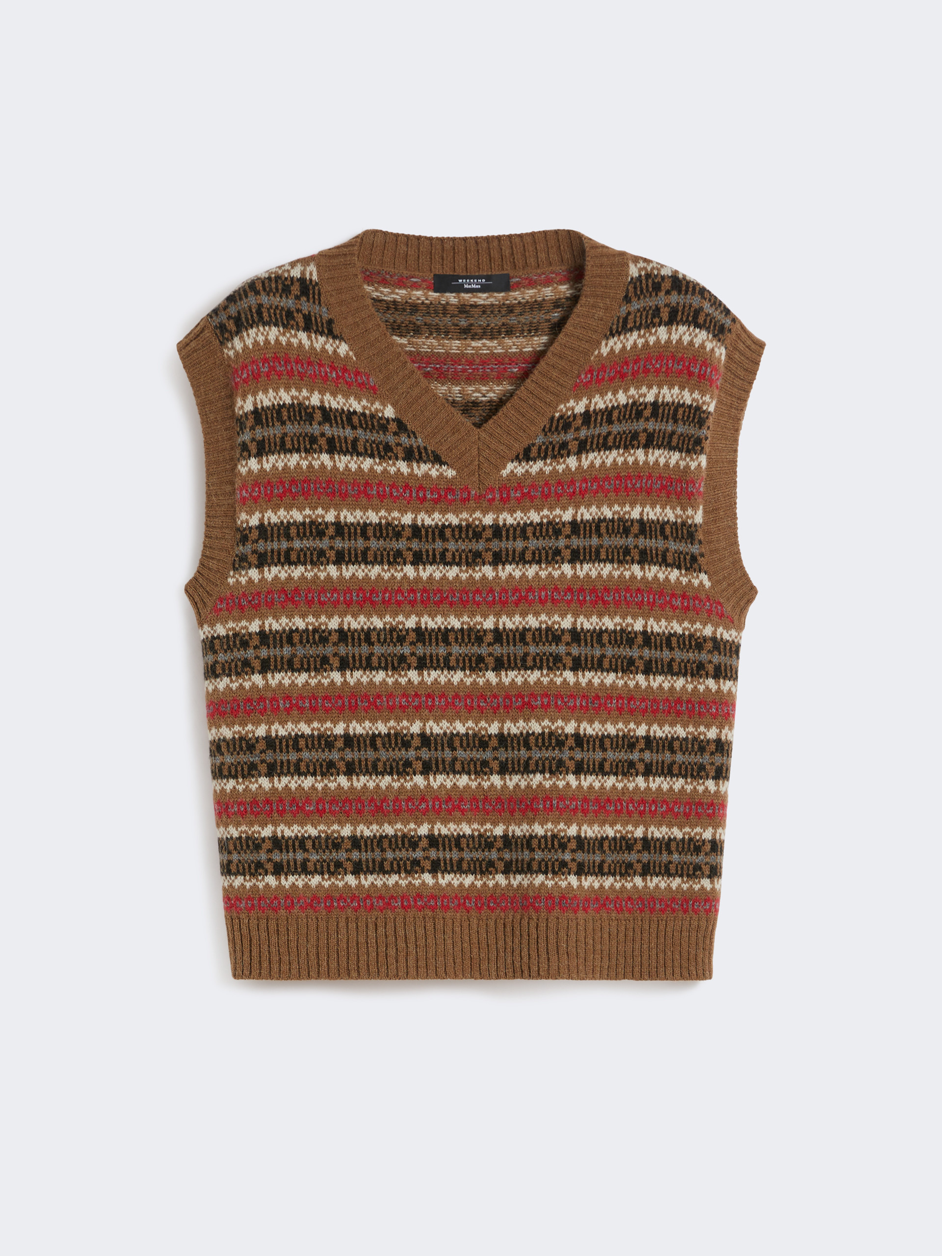 DETAILS Regular-fit gilet, embellished with an all-over jacquard knit. Wool and alpaca knit gilet Medium length V neck Sleeveless Ribbed edges COMPOSITION AND CARE 45% acrylic, 40% alpaca, 15% wool. Hand wash cold (40°c max); do not bleach; do not tumble dry; flat drying in the shade; cool iron; professionally dry clean perchloroethylene - mild process; do not wet clean.; iron with a cloth between.; using neutral detergent. Distributed by Max Mara S.r.l., registered office in Reggio Emilia (Italy), Via Giulia Maramotti 4, 42124 (IT)