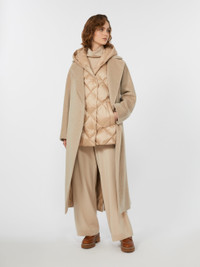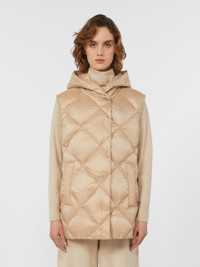 DETAILS Hooded gilet, customised with butterfly emblem on the back of the neck. Gilet in water-repellent tech fabric Regular fit Armhole with grosgrain ribbon trim Front fastening with snap buttons Welt pockets on the sides Goose-down padding COMPOSITION AND CARE Fabric 100% polyester; lining 100% polyester; - exclusive of decoration; with quilting virgin down. Machine wash cold delicate cycle; do not bleach; do not tumble dry; line drying in the shade; cool iron; professionally dry clean perchloroethylene - mild process.; home washing: wash in lukewarm water with a gentle wash machine program. use liquid detergent with neuter ph. rinse several times until clear water is discharged. dry away from direct heating. squeeze and stretch to favor volume recovery.; wash the garment while it is fastened.; don’t iron the labels.; contains non-textile parts of animal origin. Distributed by Max Mara S.r.l., registered office in Reggio Emilia (Italy), Via Giulia Maramotti 4, 42124 (IT)