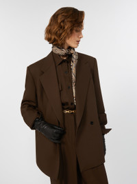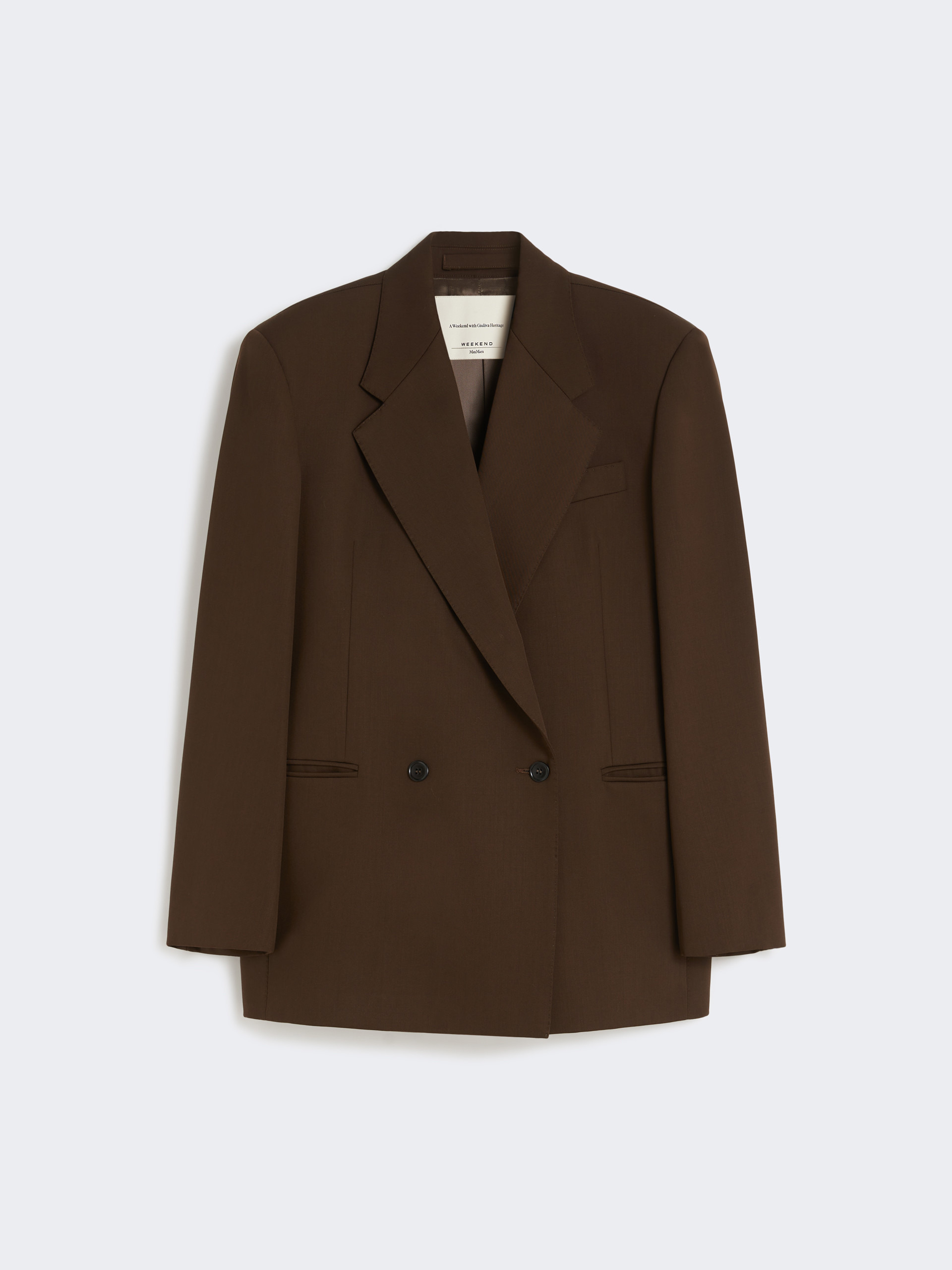 DETAILS Pure wool twill jacket featuring tailoring-style hand-stitched detail. The straight-fit garment boasts slightly oversized shoulders, lapels, long sleeves and a welt breast pocket and pockets. Double-breasted button fastening. Pure wool twill fabric Straight fit Lapel collar Long sleeves Button fastening Welt pockets COMPOSITION AND CARE Fabric 100% virgin wool; lining 50% acetate, 50% viscose; sleeves lining 53% acetate, 47% viscose. Do not wash; do not bleach; do not tumble dry; cool iron; professionally dry clean perchloroethylene - mild process; do not wet clean.; wash the garment while it is fastened.; turn the articles inside out before washing. Distributed by Max Mara S.r.l., registered office in Reggio Emilia (Italy), Via Giulia Maramotti 4, 42124 (IT)
