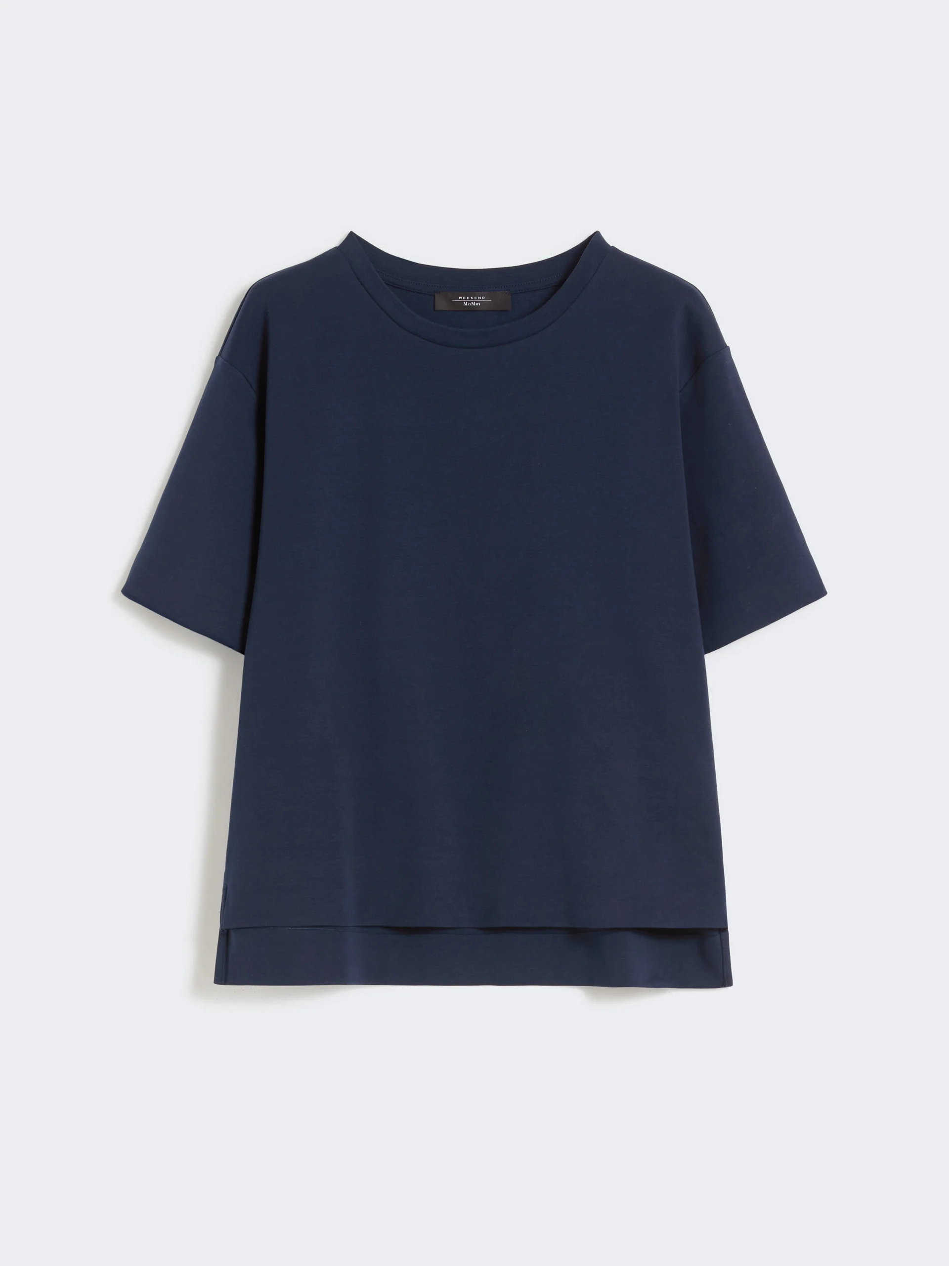 DETAILS Basic T-shirt, featuring interlock stitching and heat-sealed details. - Main fabric made of organic cotton - Pure cotton jersey T-shirt - Boxy cut with side slits - Crew neck - Short sleeves - Hem slightly longer at the back - Small logo printed on the back of the neck COMPOSITION AND CARE 100% cotton. Hand wash cold (40°c max); do not bleach; do not tumble dry; flat drying in the shade; cool iron; do not dry clean; do not wet clean.; iron with a cloth between.; using neutral detergent.; don’t rub.; turn the articles inside out before washing.; to be ironed on reverse. Distributed by Max Mara S.r.l., registered office in Reggio Emilia (Italy), Via Giulia Maramotti 4, 42124 (IT) Collection: Weekend Max Mara Product code: 5941036106004 - WKDMULTID
