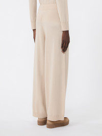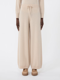 DETAILS Leisurewear-inspired knit trousers with wide leg. Wool and cashmere plain-knit trousers Loose fit Elasticated waist Adjustable drawstring Ribbed trim COMPOSITION AND CARE 80% wool, 20% cashmere. Hand wash cold (40°c max); do not bleach; do not tumble dry; flat drying in the shade; cool iron; professionally dry clean perchloroethylene - mild process; do not wet clean.; iron with a cloth between.; using neutral detergent. Distributed by Max Mara S.r.l., registered office in Reggio Emilia (Italy), Via Giulia Maramotti 4, 42124 (IT)