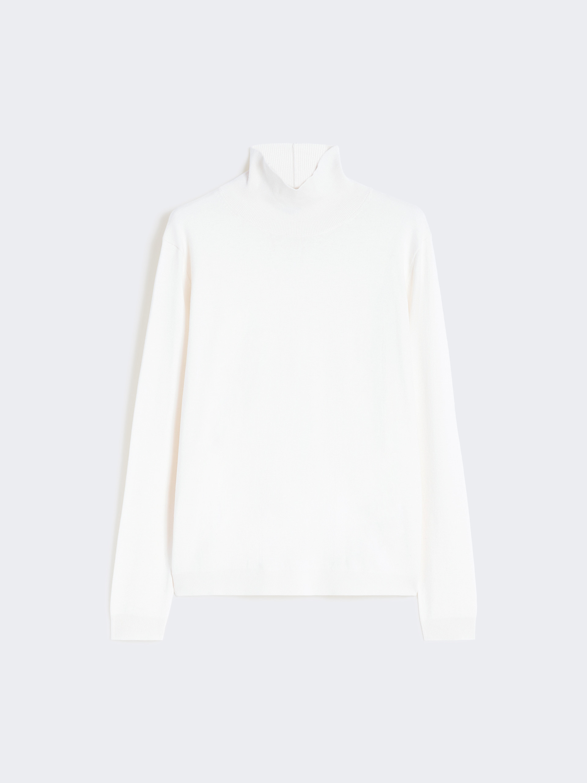 DETAILS Turtleneck jumper in a plain knit. Wool and silk knit turtleneck Relaxed fit High neck Long set-in sleeves Ribbed trim COMPOSITION AND CARE 48% silk, 26% wool, 23% polyamide, 3% elastane. Hand wash cold (40°c max); do not bleach; do not tumble dry; flat drying in the shade; cool iron; professionally dry clean perchloroethylene - mild process; do not wet clean.; iron with a cloth between.; using neutral detergent. Distributed by Max Mara S.r.l., registered office in Reggio Emilia (Italy), Via Giulia Maramotti 4, 42124 (IT)