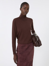 DETAILS Turtleneck jumper in a plain knit. Wool and silk knit turtleneck Relaxed fit High neck Long set-in sleeves Ribbed trim COMPOSITION AND CARE 48% silk, 26% wool, 23% polyamide, 3% elastane. Hand wash cold (40°c max); do not bleach; do not tumble dry; flat drying in the shade; cool iron; professionally dry clean perchloroethylene - mild process; do not wet clean.; iron with a cloth between.; using neutral detergent. Distributed by Max Mara S.r.l., registered office in Reggio Emilia (Italy), Via Giulia Maramotti 4, 42124 (IT)