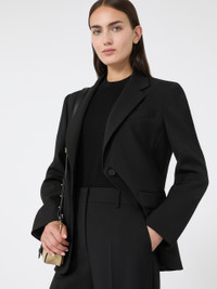 DETAILS Single-breasted blazer embellished with tailored-style details. Blazer in natural stretch pure woollen cloth Figure-skimming fit with a rear vent Lapel collar Long set-in sleeves with buttoned hem detail One-button fastening Breast pocket and flap front pockets Lined model COMPOSITION AND CARE Fabric 100% virgin wool; lining 100% polyester. Do not wash; do not bleach; do not tumble dry; cool iron; professionally dry clean perchloroethylene - mild process; do not wet clean.; wash the garment while it is fastened.; contains non-textile parts of animal origin. Distributed by Max Mara S.r.l., registered office in Reggio Emilia (Italy), Via Giulia Maramotti 4, 42124 (IT)
