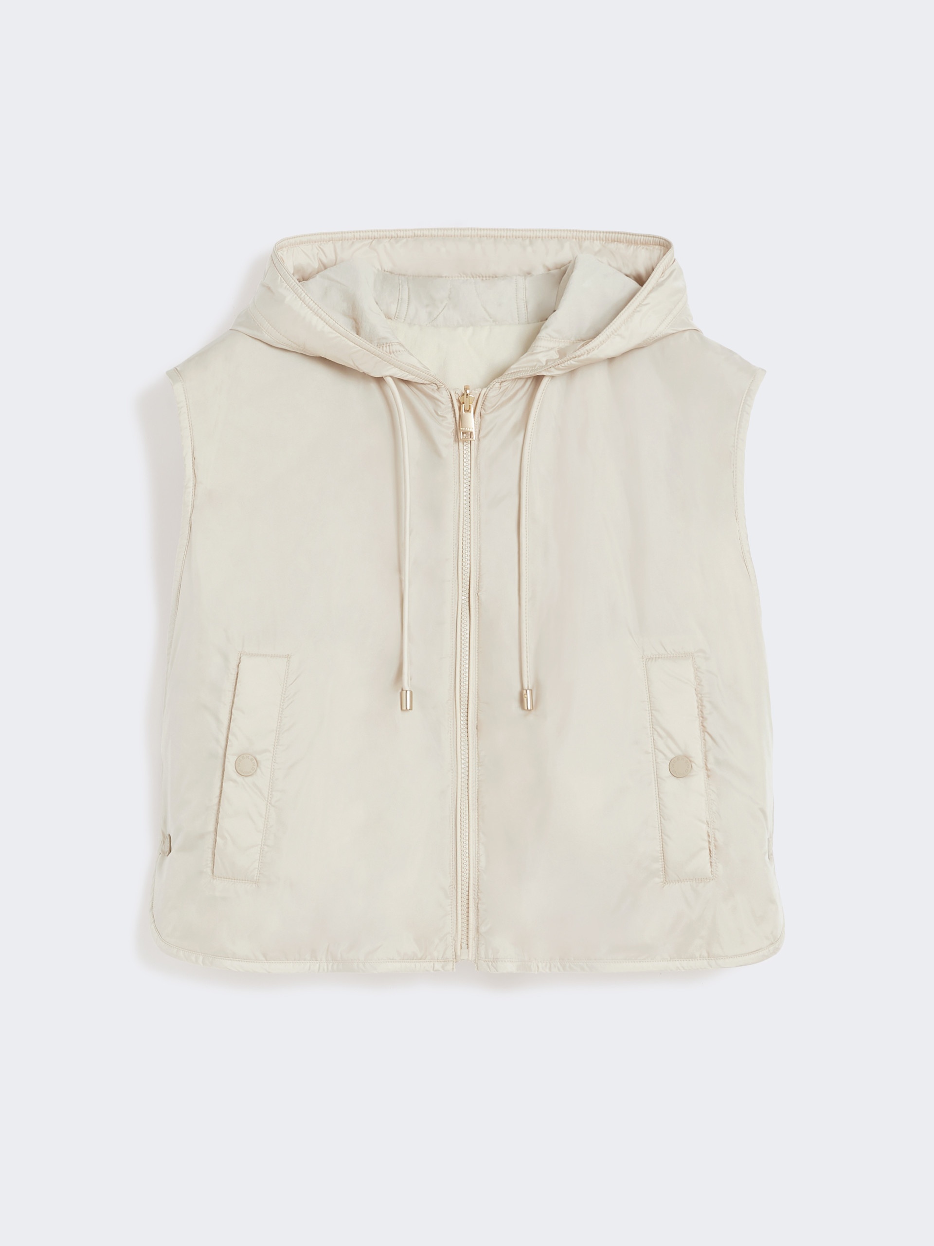 DETAILS Short gilet with a drawstring hood and the following padding: Luxepad Ultra Fine Insulating Technology Camel-Silk Blend Edition. Water-repellent canvas gilet with an onion-quilted interior Straight fit with an adjustable internal waist drawstring Front zip fastening Welt pockets on both sides Press stud-fastening side slits Weekend Max Mara logo print on the yoke lining COMPOSITION AND CARE Fabric 100% polyester; with quilting in 49% polyester, 46% camelwool, 5% silk; inner fabric 100% polyamide; internal upper part 100% cotton; - exclusive of decoration. Do not wash; do not bleach; do not tumble dry; do not iron; professionally dry clean perchloroethylene - mild process; do not wet clean.; don’t iron the labels.; protect zipper tongue and slide before cleaning.; protect the ends stoppers and/or the cord ends before washing. Distributed by Max Mara S.r.l., registered office in Reggio Emilia (Italy), Via Giulia Maramotti 4, 42124 (IT)