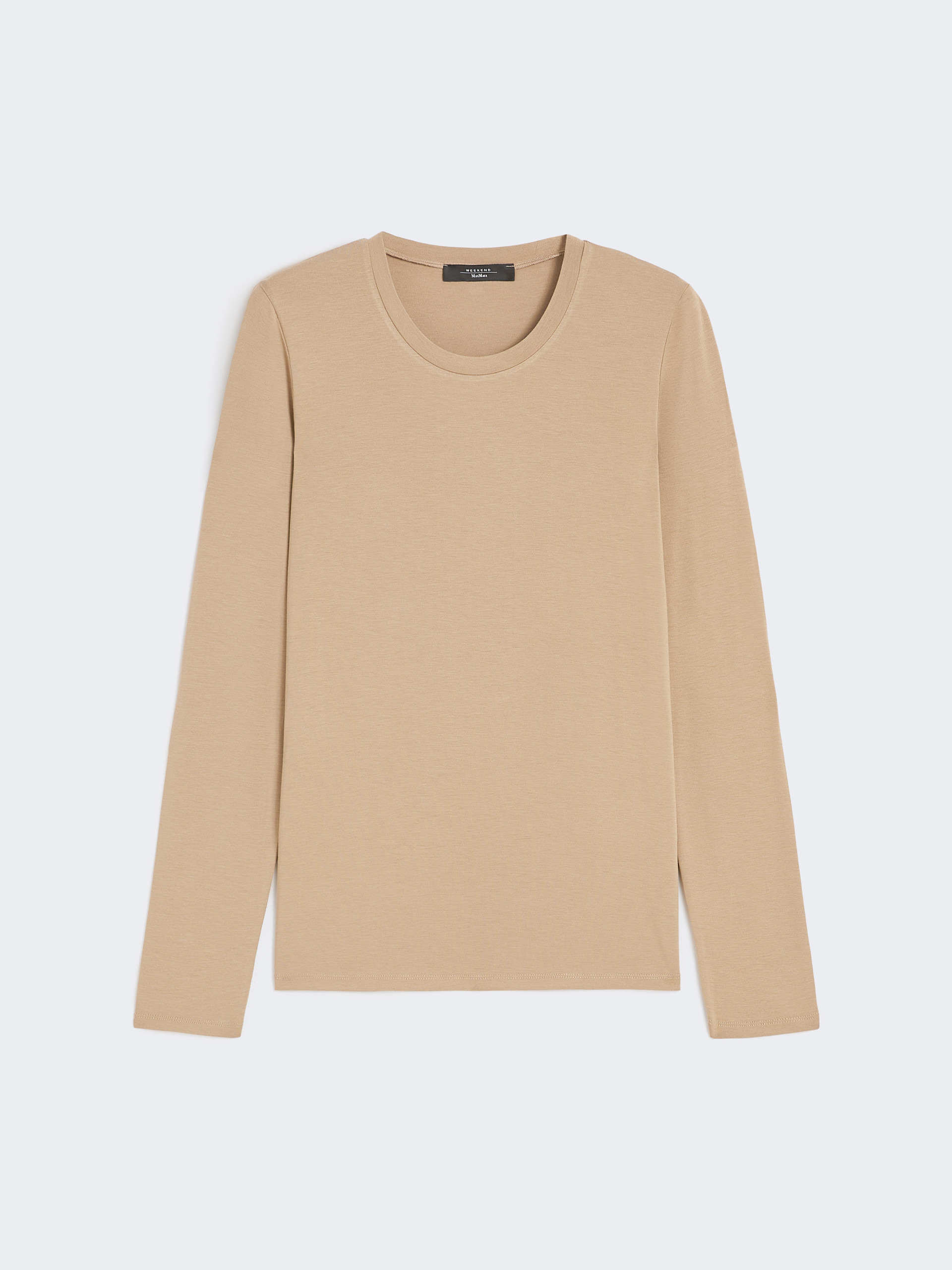 DETAILS Basic T-shirt with an essential and feminine silhouette. T-shirt in stretch-viscose jersey Figure-hugging Offset crew neck Long set-in sleeves Butterfly logo printed on the back of the collar COMPOSITION AND CARE 95% viscose, 5% elastane. Hand wash cold (40°c max); do not bleach; do not tumble dry; drip line drying in the shade; cool iron; do not dry clean; do not wet clean.; iron with a cloth between.; using neutral detergent.; don’t rub.; turn the articles inside out before washing.; to be ironed on reverse. Distributed by Max Mara S.r.l., registered office in Reggio Emilia (Italy), Via Giulia Maramotti 4, 42124 (IT)