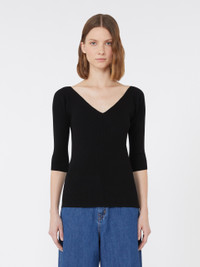 DETAILS Slim-fit sweater featuring a silhouette-accentuating rib-knit pattern. - Stretch viscose yarn sweater - Wide V-neck front and back - Elbow-length kimono sleeves - Regular length - Tubular trims COMPOSITION AND CARE 77% viscose, 23% polyester. Hand wash cold; do not bleach; do not tumble dry; flat drying in the shade; cool iron; professionally dry clean perchloroethylene - mild process; do not wet clean.; iron with a cloth between.; using neutral detergent. Distributed by Max Mara S.r.l., registered office in Reggio Emilia (Italy), Via Giulia Maramotti 4, 42124 (IT)