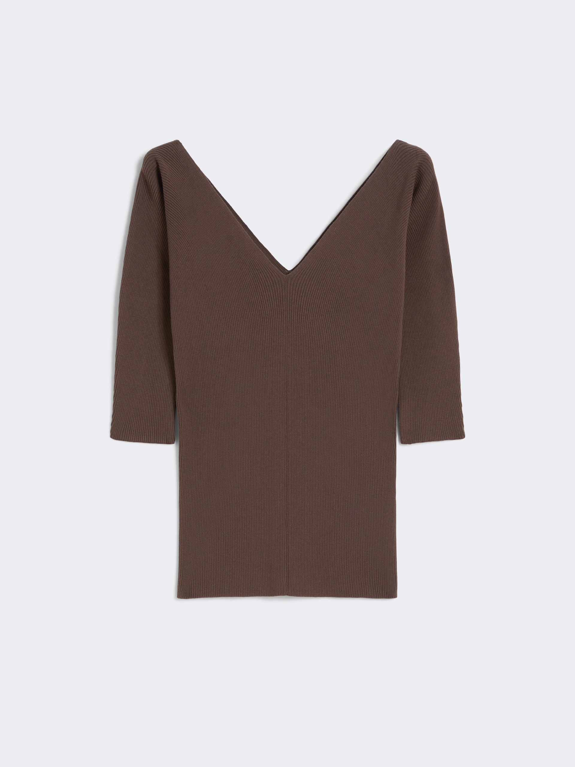 DETAILS Slim-fit sweater featuring a silhouette-accentuating rib-knit pattern. Stretch viscose yarn sweater Wide V-neck front and back Elbow-length kimono sleeves Regular length Tubular trims COMPOSITION AND CARE 77% viscose, 23% polyester. Hand wash cold; do not bleach; do not tumble dry; flat drying in the shade; cool iron; professionally dry clean perchloroethylene - mild process; do not wet clean.; iron with a cloth between.; using neutral detergent. Distributed by Max Mara S.r.l., registered office in Reggio Emilia (Italy), Via Giulia Maramotti 4, 42124 (IT)