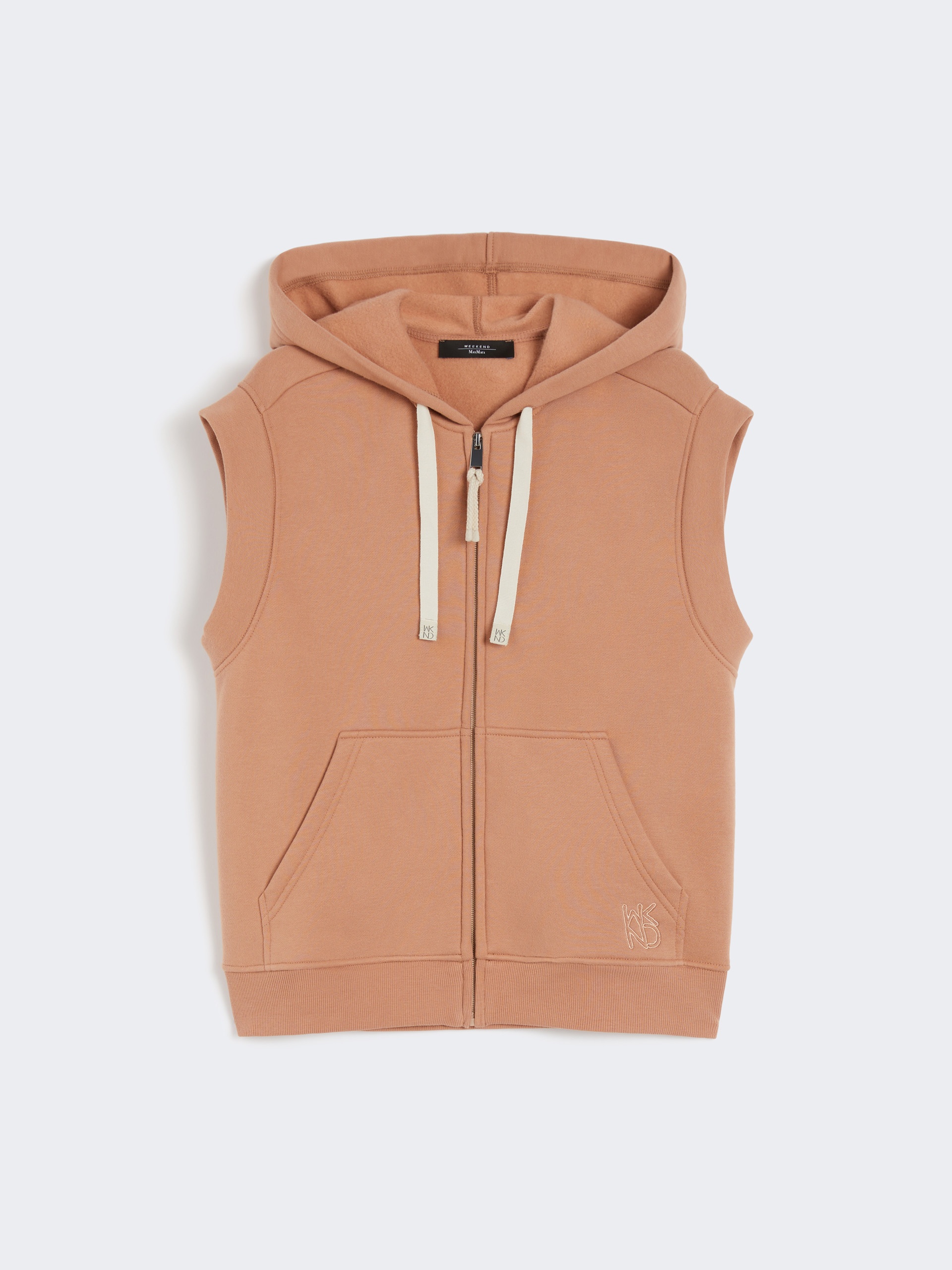 DETAILS Soft-textured gilet featuring a drawstring hood and branded WKND ribbons. Main fabric with at least 50% cotton fibers, grown and processed according to organic farming systems Cotton fleece jersey gilet Boxy fit Front zip fastening Kangaroo front pocket with embroidered logo detail Dropped shoulders Rib-knit trim COMPOSITION AND CARE Jersey fabric 87% cotton, 13% polyester; - exclusive of embroideries. Machine wash cold delicate cycle; do not bleach; do not tumble dry; flat drying in the shade; cool iron; do not dry clean; professional wet cleaning - very mild process.; iron with a cloth between.; using neutral detergent.; turn the articles inside out before washing.; to be ironed on reverse. Distributed by Max Mara S.r.l., registered office in Reggio Emilia (Italy), Via Giulia Maramotti 4, 42124 (IT)