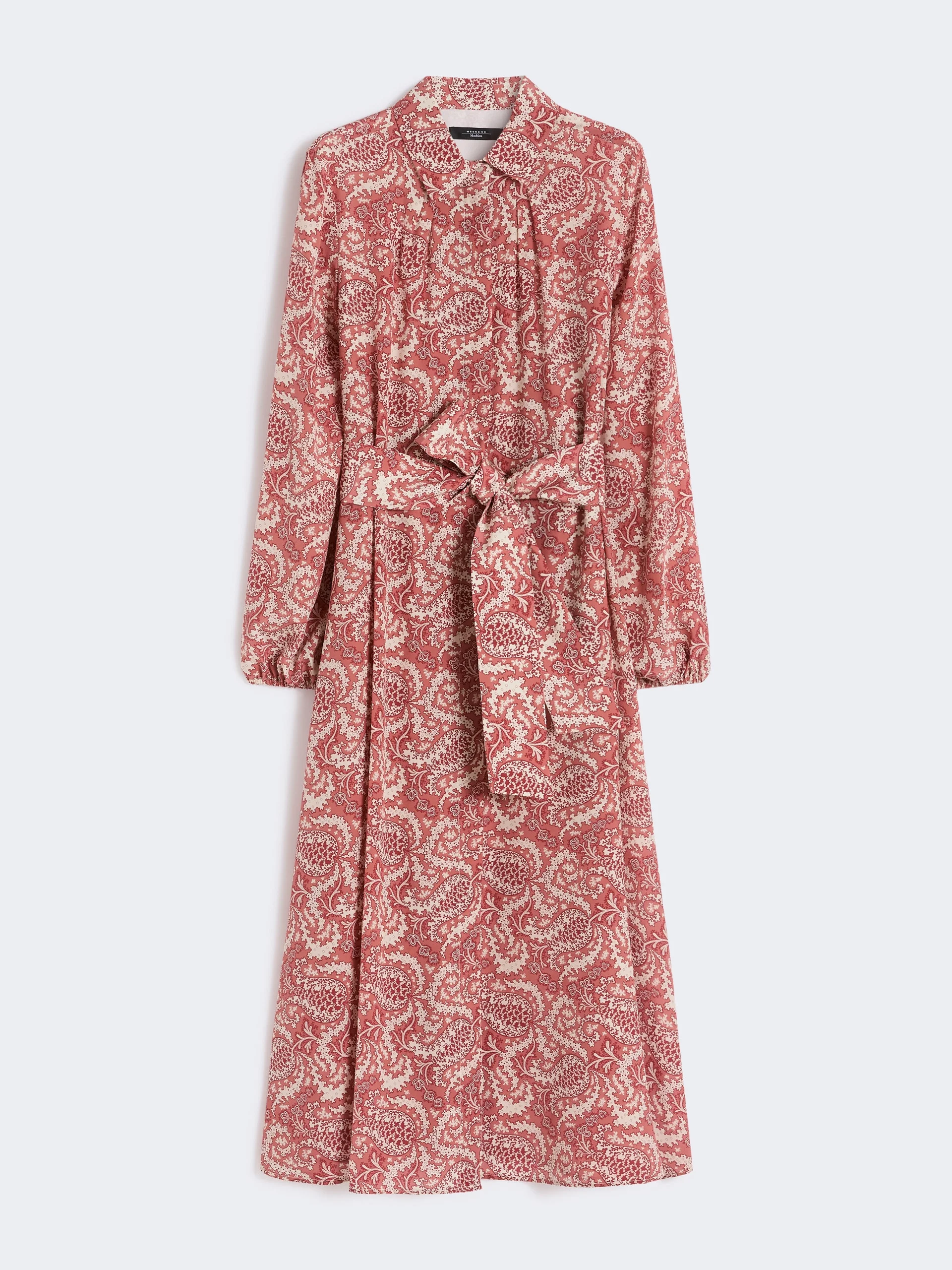 DETAILS Long shirt dress with a flared silhouette and matching belt at the waist. - Regular fit - Printed pure silk dress - Shirt collar - Long sleeves with elastic cuffs - Concealed front fastening that runs the length of the garment - Side inset pockets - Back yoke seam - Unlined COMPOSITION AND CARE 100% silk. Hand wash cold (40°c max); do not bleach; do not tumble dry; line drying in the shade; cool iron; professionally dry clean perchloroethylene - mild process; do not wet clean.; wash the garment while it is fastened.; turn the articles inside out before washing.; contains non-textile parts of animal origin. Distributed by Max Mara S.r.l., registered office in Reggio Emilia (Italy), Via Giulia Maramotti 4, 42124 (IT) Collection: Weekend Max Mara Product code: 5221176206010 - WKDUBICATO