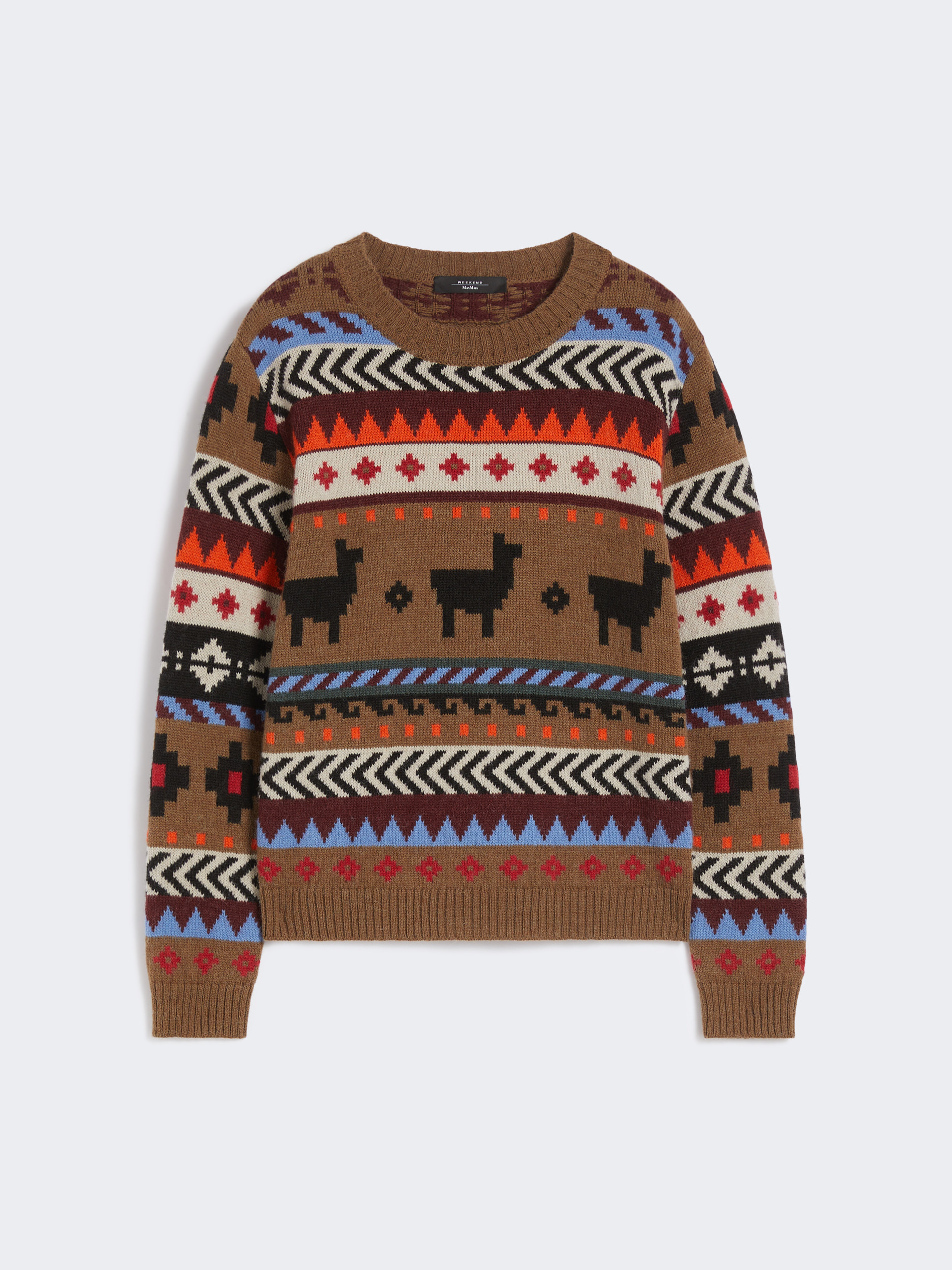 DETAILS Crew-neck jumper, featuring a jacquard knit that creates a contrasting all-over pattern. Wool and alpaca knit jumper Regular volume and medium length Long set-in sleeves Ribbed trim COMPOSITION AND CARE 45% acrylic, 40% alpaca, 15% wool. Hand wash cold (40°c max); do not bleach; do not tumble dry; flat drying in the shade; cool iron; professionally dry clean perchloroethylene - mild process; do not wet clean.; iron with a cloth between.; using neutral detergent. Distributed by Max Mara S.r.l., registered office in Reggio Emilia (Italy), Via Giulia Maramotti 4, 42124 (IT)