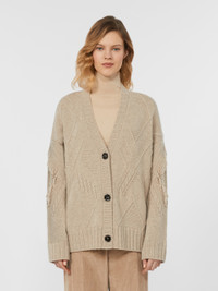DETAILS Cardigan featuring varying knit stitches that bring structure to the garment’s texture. Pure wool yarn cardigan Loose fit V neck Long sleeves with dropped shoulders Three-button front fastening Fringe details on sleeves Ribbed trim COMPOSITION AND CARE 100% virgin wool. Hand wash cold (40°c max); do not bleach; do not tumble dry; flat drying in the shade; cool iron; professionally dry clean perchloroethylene - mild process; do not wet clean.; iron with a cloth between.; using neutral detergent. Distributed by Max Mara S.r.l., registered office in Reggio Emilia (Italy), Via Giulia Maramotti 4, 42124 (IT)