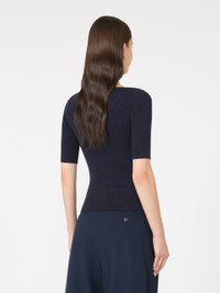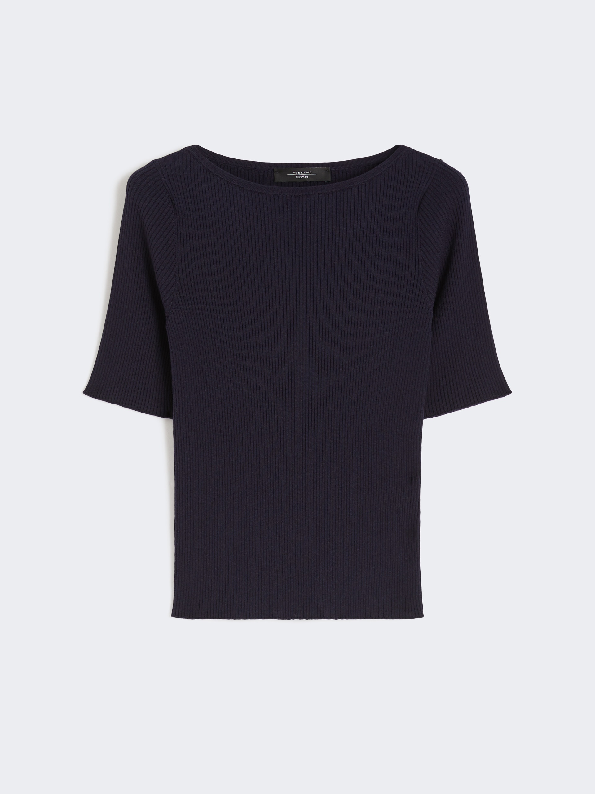 DETAILS T-shirt featuring a feminine silhouette-accentuating rib-knit pattern. Stretch viscose yarn T-shirt Slim fit Boat neckline Short set-in sleeves Regular length COMPOSITION AND CARE 77% viscose, 23% polyester. Hand wash cold; do not bleach; do not tumble dry; flat drying in the shade; cool iron; professionally dry clean perchloroethylene - mild process; do not wet clean.; iron with a cloth between.; using neutral detergent. Distributed by Max Mara S.r.l., registered office in Reggio Emilia (Italy), Via Giulia Maramotti 4, 42124 (IT)